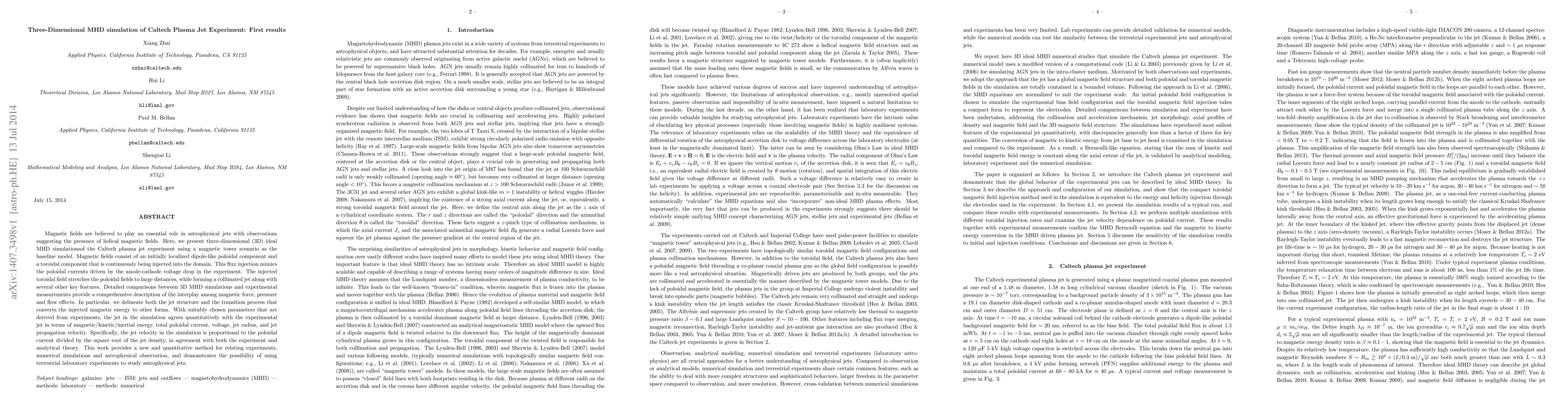 This paper presents three-dimensional ideal MHD simulations of the Caltech plasma jet experiment, showing how magnetic fields transform into a collimated jet. The study quantitatively matches experimental results, providing insights into the conversion of magnetic energy into kinetic and inertial forms, and demonstrating the potential of terrestrial experiments to study astrophysical jets.