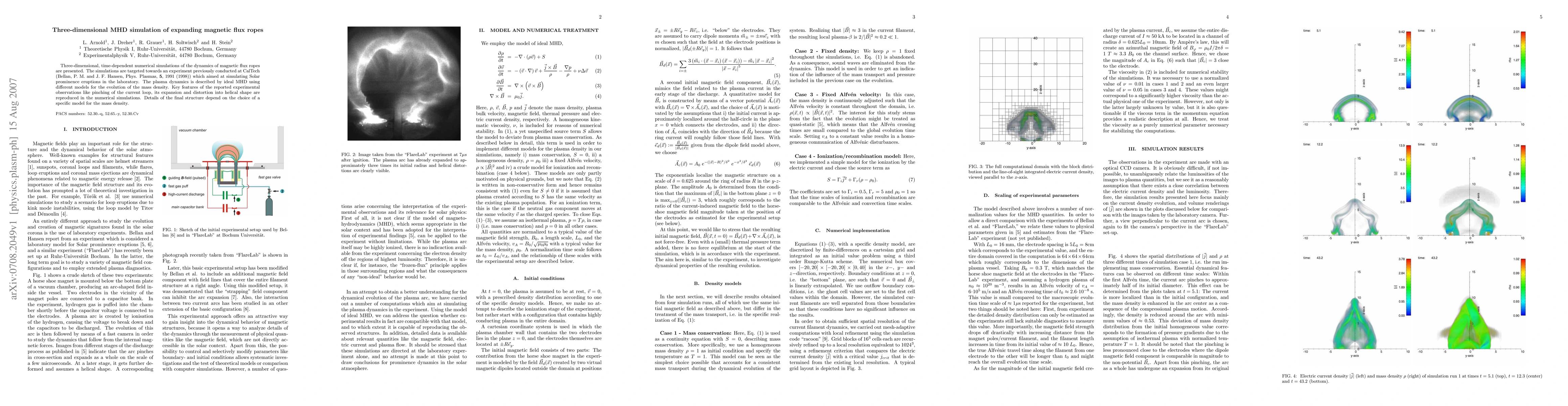 This paper presents three-dimensional MHD simulations of expanding magnetic flux ropes, aiming to replicate laboratory experiments simulating solar prominence eruptions. The simulations reproduce key experimental observations, including the pinching and helical distortion of the current loop, with results varying based on the chosen mass density model.