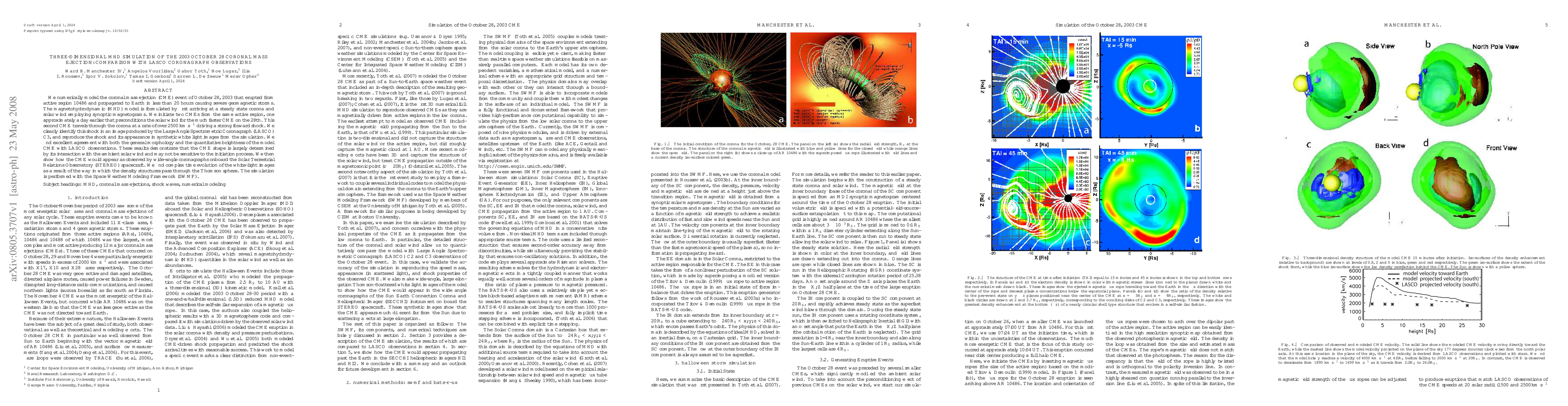 We numerically model the coronal mass ejection (CME) event of October 28, 2003 that erupted from active region 10486 and propagated to Earth in less than 20 hours causing severe geomagnetic storms. The magnetohydrodynamic (MHD) model is formulated by first arriving at a steady state corona and solar wind employing synoptic magnetograms. We initiate two CMEs from the same active region, one approximately a day earlier that preconditions the solar wind for the much faster CME on the 28th. This second CME travels through the corona at a rate of over 2500 km s$^{-1}$ driving a strong forward shock. We clearly identify this shock in an image produced by the Large Angle Spectrometric Coronagraph (LASCO) C3, and reproduce the shock and its appearance in synthetic white light images from the simulation. We find excellent agreement with both the general morphology and the quantitative brightness of the model CME with LASCO observations. These results demonstrate that the CME shape is largely determined by its interaction with the ambient solar wind and may not be sensitive to the initiation process. We then show how the CME would appear as observed by wide-angle coronagraphs onboard the Solar Terrestrial Relations Observatory (STEREO) spacecraft. We find complex time evolution of the white-light images as a result of the way in which the density structures pass through the Thomson sphere. The simulation is performed with the Space Weather Modeling Framework (SWMF).