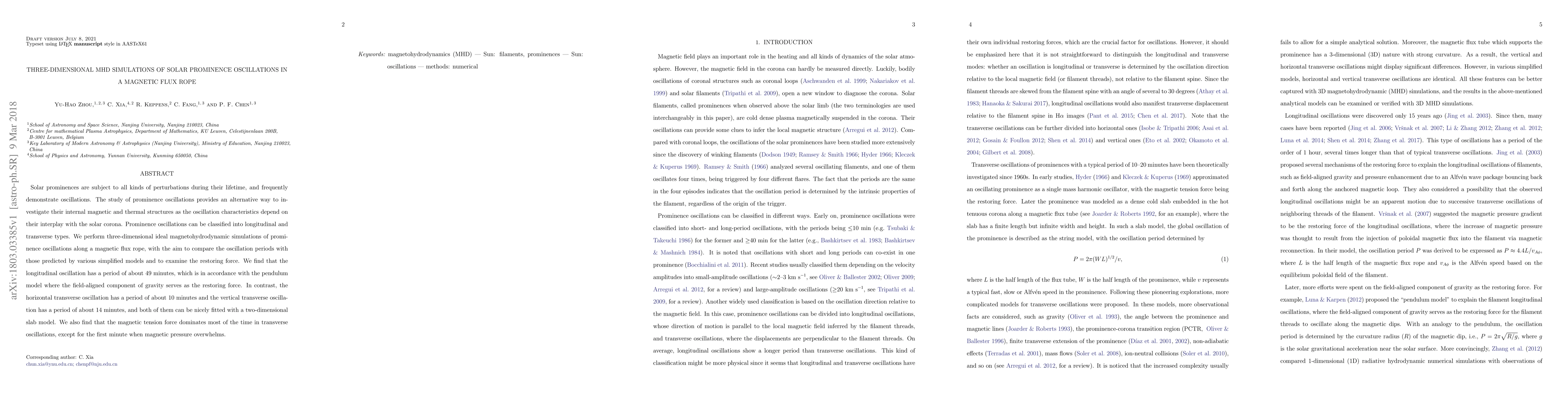 This paper uses three-dimensional MHD simulations to study solar prominence oscillations along a magnetic flux rope, finding longitudinal oscillations match the pendulum model and transverse oscillations align with a slab model, with magnetic tension force dominating the restoring mechanism.