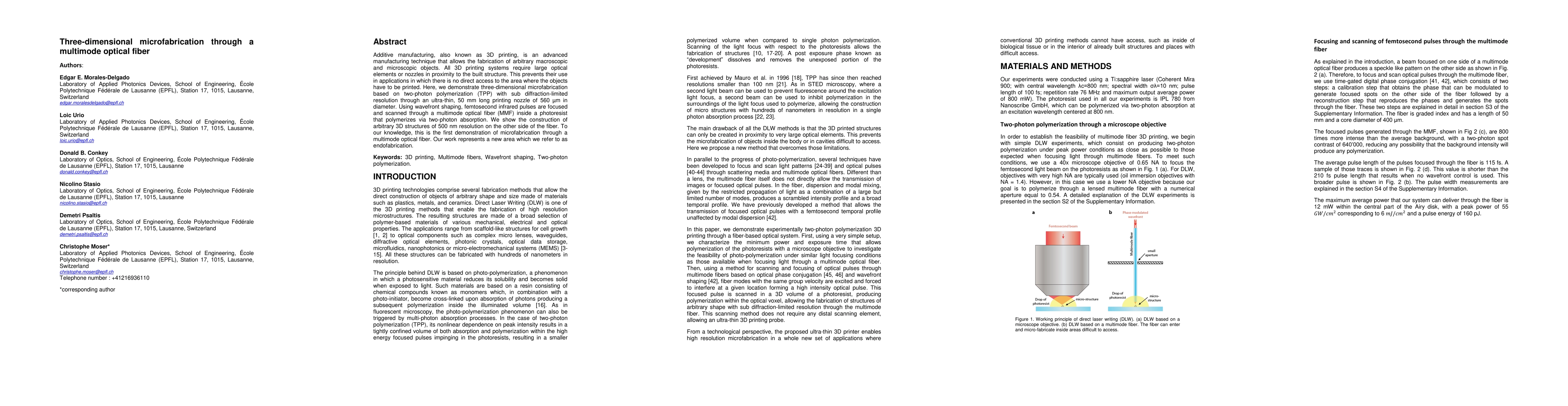 Additive manufacturing, also known as 3D printing, is an advanced manufacturing technique that allows the fabrication of arbitrary macroscopic and microscopic objects. All 3D printing systems require large optical elements or nozzles in proximity to the built structure. This prevents their use in applications in which there is no direct access to the area where the objects have to be printed. Here, we demonstrate three-dimensional microfabrication based on two-photon polymerization (TPP) with sub diffraction-limited resolution through an ultra-thin, 50 mm long printing nozzle of 560 micrometers in diameter. Using wavefront shaping, femtosecond infrared pulses are focused and scanned through a multimode optical fiber (MMF) inside a photoresist that polymerizes via two-photon absorption. We show the construction of arbitrary 3D structures of 500 nm resolution on the other side of the fiber. To our knowledge, this is the first demonstration of microfabrication through a multimode optical fiber. Our work represents a new area which we refer to as endofabrication.