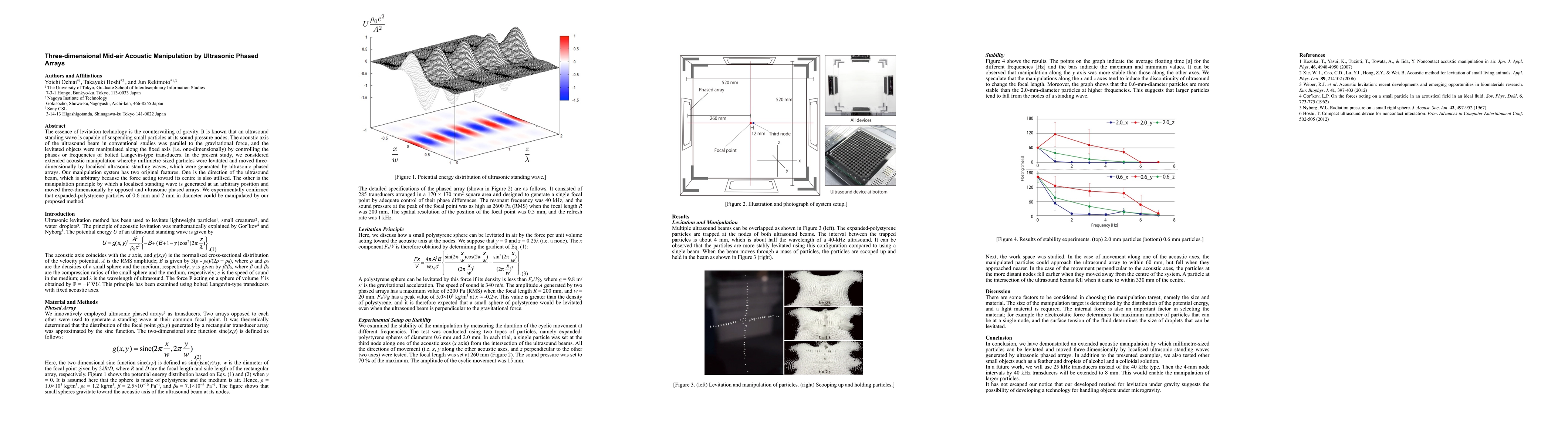 This paper presents a novel three-dimensional mid-air acoustic manipulation system using ultrasonic phased arrays to levitate and move millimetre-sized particles in any direction, overcoming the limitations of conventional one-dimensional manipulation. The system's unique features include arbitrary ultrasound beam direction and localised standing wave generation for precise three-dimensional control.