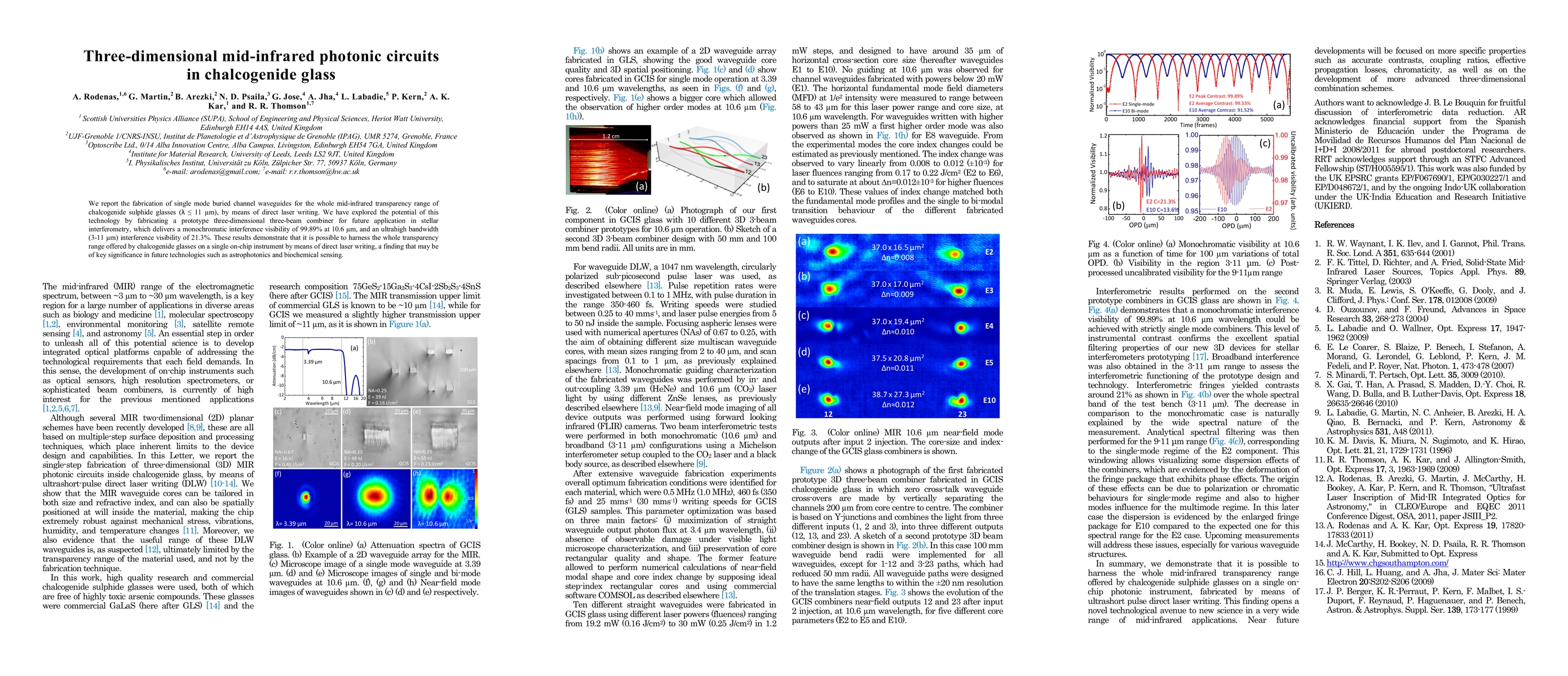 This paper details the fabrication of single mode waveguides in chalcogenide glass using direct laser writing, achieving high-visibility interference for mid-infrared wavelengths. The prototype three-dimensional three-beam combiner shows potential for stellar interferometry and biochemical sensing applications.