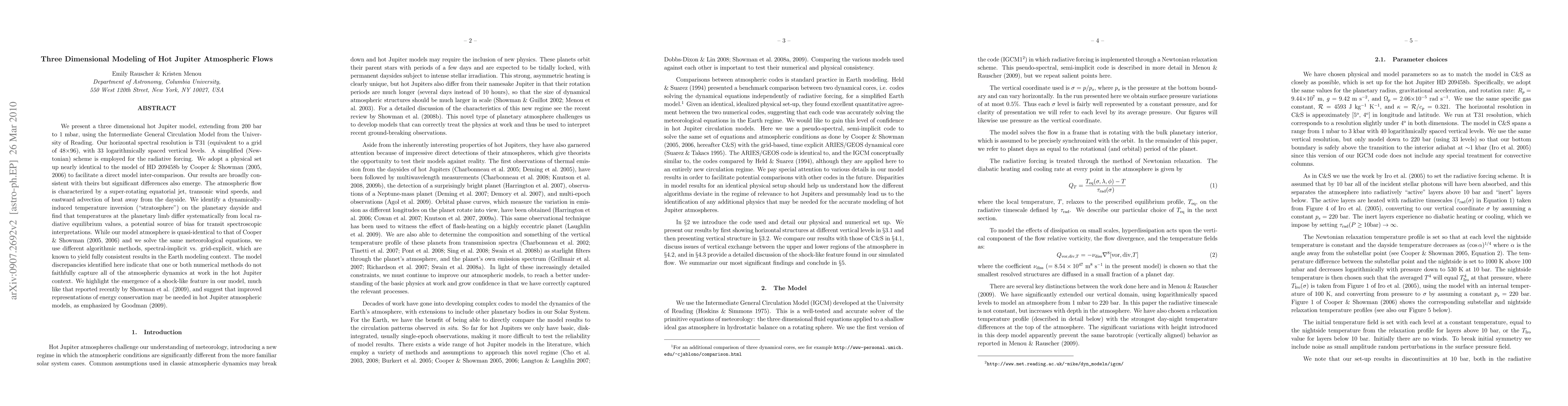 This paper presents a three-dimensional model of hot Jupiter atmospheric flows using a spectral-implicit method, revealing super-rotating equatorial jets and transonic wind speeds. It identifies discrepancies with previous models, suggesting that current numerical methods may not fully capture the atmospheric dynamics of hot Jupiters.