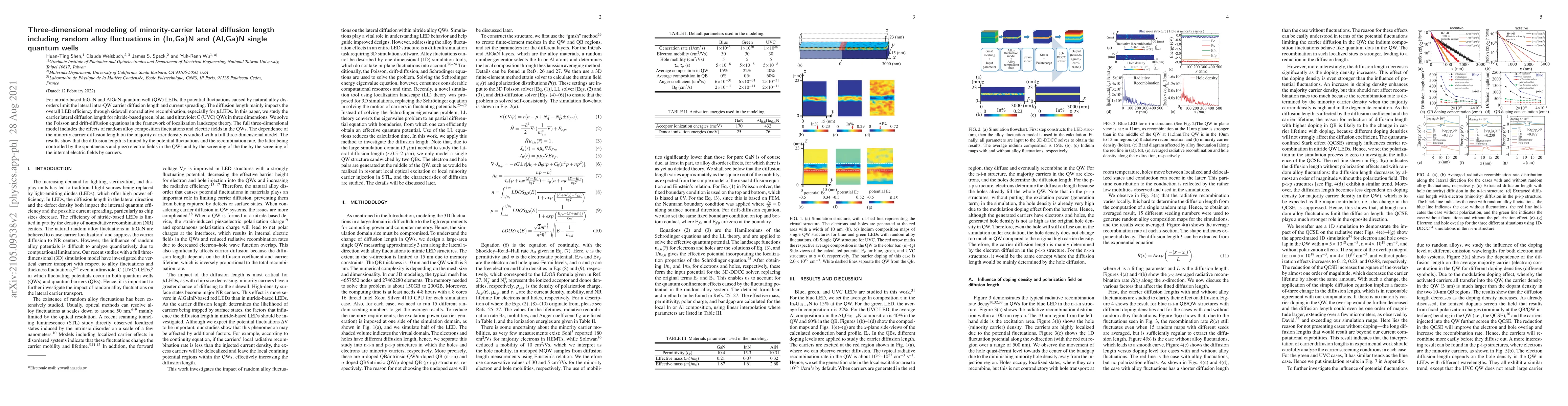 This paper develops a three-dimensional model to study minority-carrier lateral diffusion in InGaN and AlGaN quantum wells, considering random alloy fluctuations. The model reveals that potential fluctuations due to alloy disorder limit carrier diffusion, impacting LED efficiency through sidewall recombination.