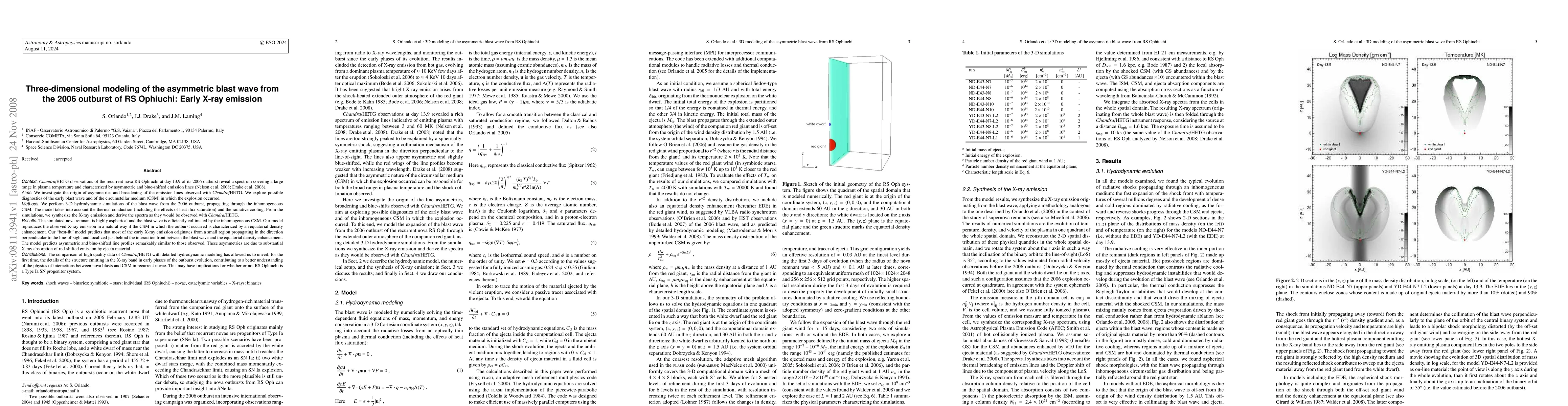 This paper uses 3-D hydrodynamic simulations to model the asymmetric blast wave from the 2006 outburst of RS Ophiuchi, explaining the observed early X-ray emission and emission line asymmetries. The model suggests that the early X-ray emission originates from a region behind the interaction front, influenced by an equatorial density enhancement in the circumstellar medium.