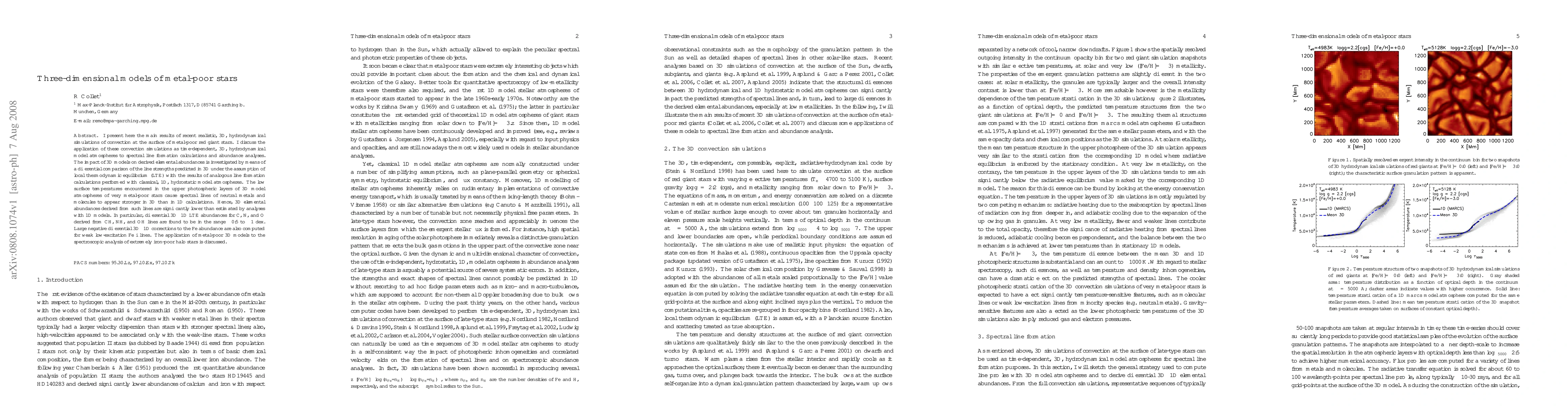 I present here the main results of recent realistic, 3D, hydrodynamical simulations of convection at the surface of metal-poor red giant stars. I discuss the application of these convection simulations as time-dependent, 3D, hydrodynamical model atmospheres to spectral line formation calculations and abundance analyses. The impact of 3D models on derived elemental abundances is investigated by means of a differential comparison of the line strengths predicted in 3D under the assumption of local thermodynamic equilibrium (LTE) with the results of analogous line formation calculations performed with classical, 1D, hydrostatic model atmospheres. The low surface temperatures encountered in the upper photospheric layers of 3D model atmospheres of very metal-poor stars cause spectral lines of neutral metals and molecules to appear stronger in 3D than in 1D calculations. Hence, 3D elemental abundances derived from such lines are significantly lower than estimated by analyses with 1D models. In particular, differential 3D$-$1D LTE abundances for C, N, and O derived from CH, NH, and OH lines are found to be in the range -0.5 to -1 dex. Large negative differential 3D-1D corrections to the Fe abundance are also computed for weak low-excitation neutral Fe lines. The application of metal-poor 3D models to the spectroscopic analysis of extremely iron-poor halo stars is discussed.