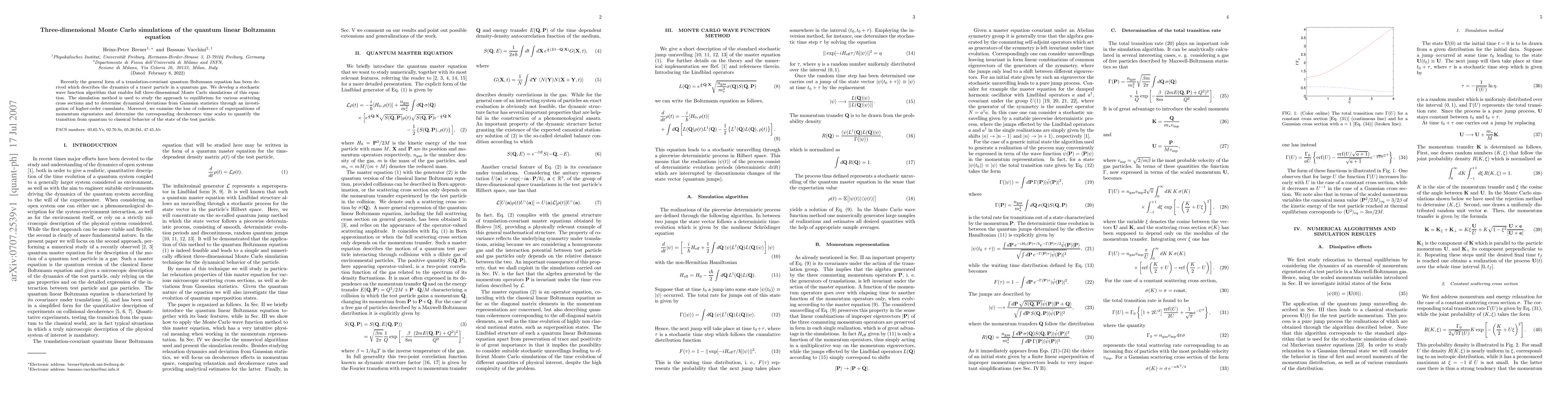 This paper develops a three-dimensional Monte Carlo simulation method for the quantum linear Boltzmann equation, enabling the study of equilibrium dynamics and decoherence in quantum gases. The method is used to analyze deviations from Gaussian statistics and quantify the transition from quantum to classical behavior.