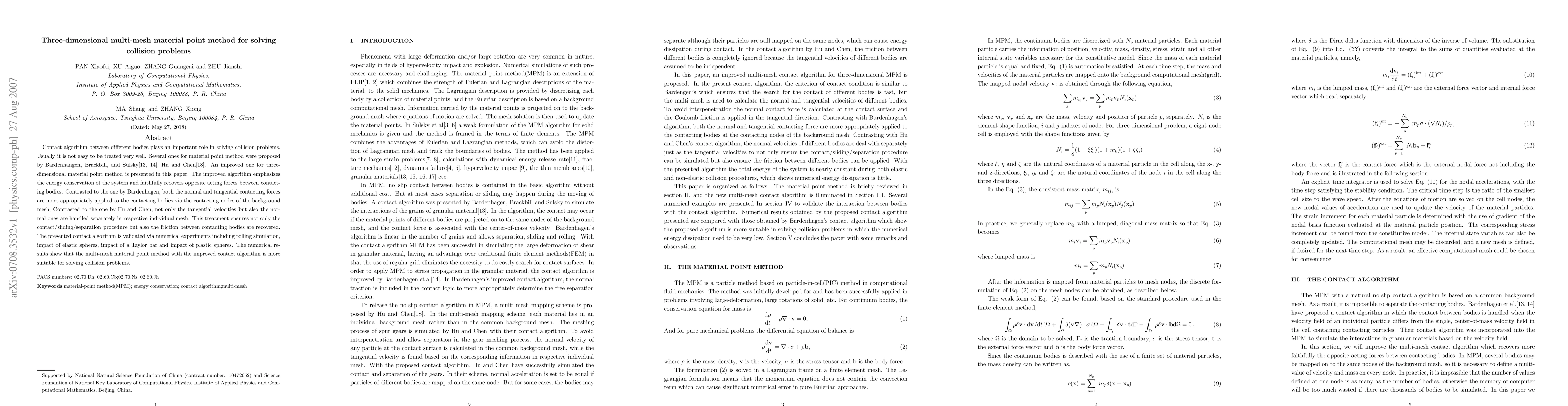 This paper proposes an enhanced three-dimensional multi-mesh material point method for collision problems, focusing on energy conservation and accurate force recovery. The new algorithm improves upon existing methods by separately handling normal and tangential velocities and forces, validated through simulations showing better performance.