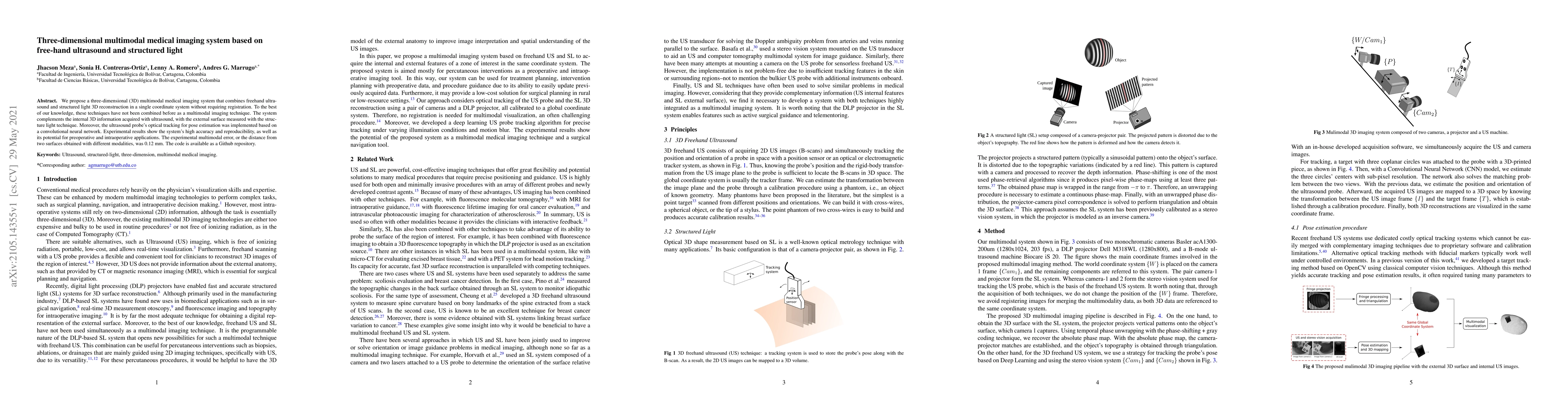This research proposes a novel 3D multimodal medical imaging system integrating freehand ultrasound and structured light for simultaneous 3D reconstruction, achieving high accuracy with an experimental multimodal error of 0.12 mm, and demonstrating potential for preoperative and intraoperative applications. The system's convolutional neural network-based optical tracking enhances its precision and reproducibility.
