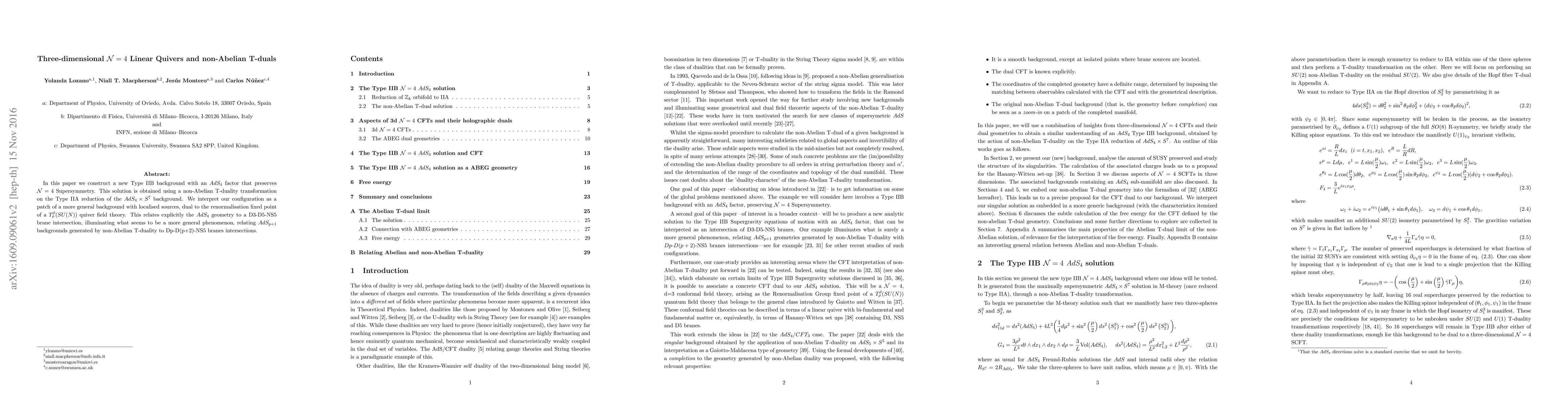 In this paper we construct a new Type IIB background with an $AdS_4$ factor that preserves ${\cal N}=4$ Supersymmetry. This solution is obtained using a non-Abelian T-duality transformation on the Type IIA reduction of the $AdS_4\times S^7$ background. We interpret our configuration as a patch of a more general background with localised sources, dual to the renormalisation fixed point of a $T_{\rho}^{\hat{\rho}} (SU(N))$ quiver field theory. This relates explicitly the $AdS_4$ geometry to a D3-D5-NS5 brane intersection, illuminating what seems to be a more general phenomenon, relating $AdS_{p+1}$ backgrounds generated by non-Abelian T-duality to Dp-D(p+2)-NS5 branes intersections.