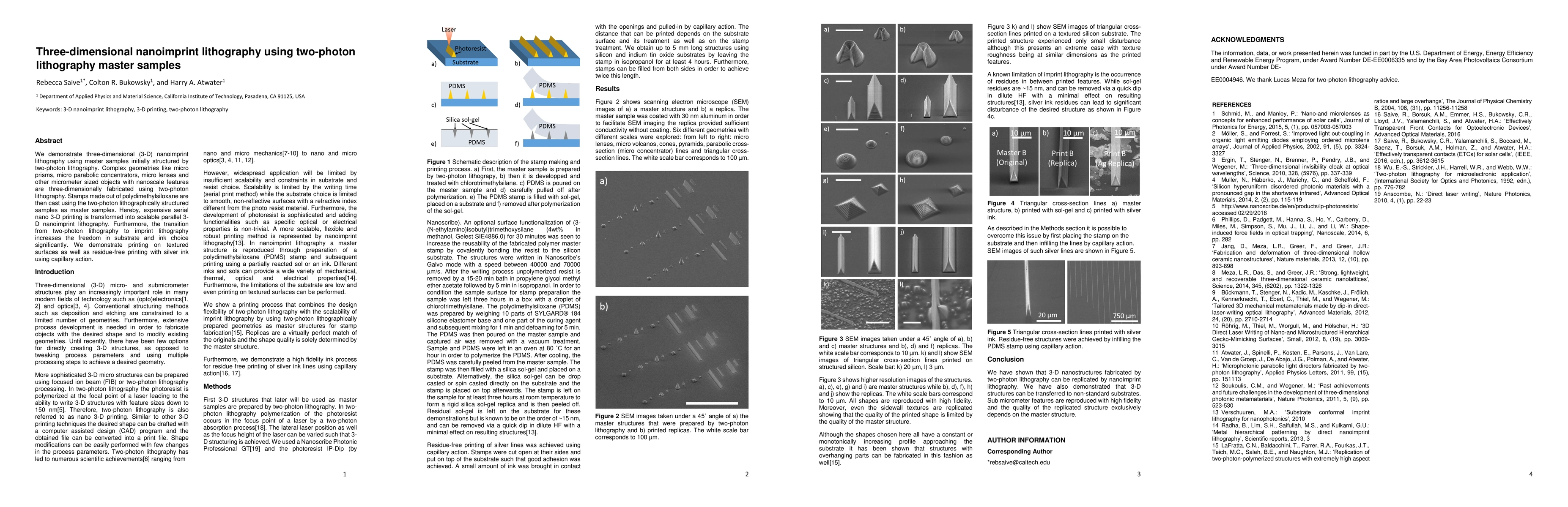 This paper demonstrates the scalable fabrication of complex three-dimensional nanostructures using two-photon lithography to create master samples, followed by parallel 3-D nanoimprint lithography, which offers flexibility in substrate and ink choices and allows residue-free printing on textured surfaces.