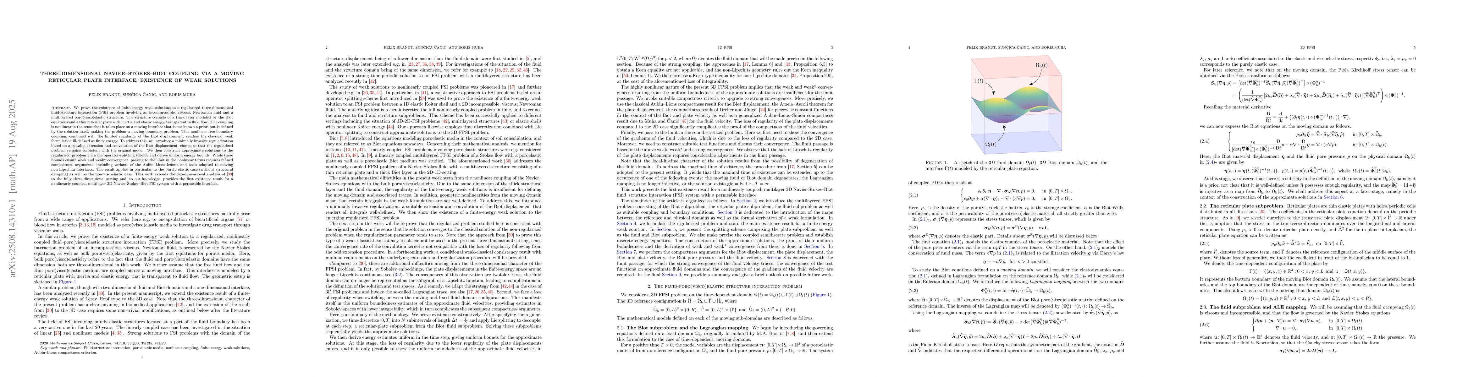 We prove the existence of finite-energy weak solutions to a regularized three-dimensional fluid-structure interaction (FSI) problem involving an incompressible, viscous, Newtonian fluid and a multilayered poro(visco)elastic structure. The structure consists of a thick layer modeled by the Biot equations and a thin reticular plate with inertia and elastic energy, transparent to fluid flow. The coupling is nonlinear in the sense that it takes place on a moving interface that is not known a priori but is defined by the solution itself, making the problem a moving-boundary problem. This nonlinear free-boundary coupling, combined with the limited regularity of the Biot displacement, renders the classical weak formulation ill-defined at finite energy. To address this, we introduce a minimally invasive regularization based on a suitable extension and convolution of the Biot displacement, chosen so that the regularized problem remains consistent with the original model. We then construct approximate solutions to the regularized problem via a Lie operator-splitting scheme and derive uniform energy bounds. While these bounds ensure weak and weak* convergence, passing to the limit in the nonlinear terms requires refined compactness arguments, including variants of the Aubin-Lions lemma and tools adapted to moving non-Lipschitz interfaces. The result applies in particular to the purely elastic case (without structural damping) as well as the poroviscoelastic case. This work extends the two-dimensional analysis of Kuan-\v{C}ani\'c-Muha 2024 to the fully three-dimensional setting and, to our knowledge, provides the first existence result for a nonlinearly coupled, multilayer 3D Navier-Stokes-Biot FSI system with a permeable interface.