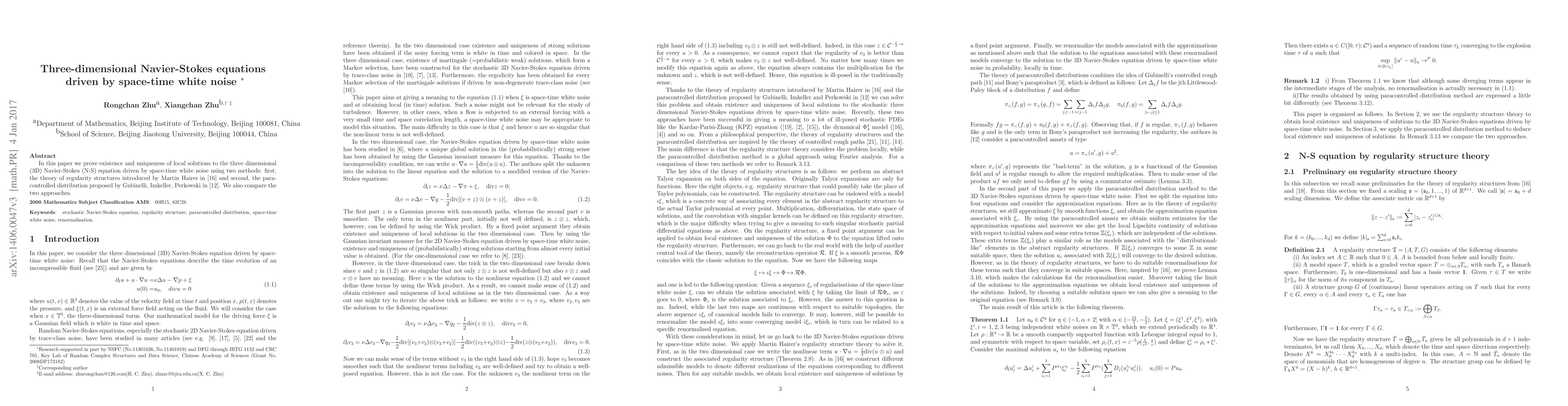 This paper utilizes regularity structure theory and paracontrolled distributions to investigate the 3D Navier-Stokes equations driven by space-time white noise, achieving local existence and uniqueness of solutions.
