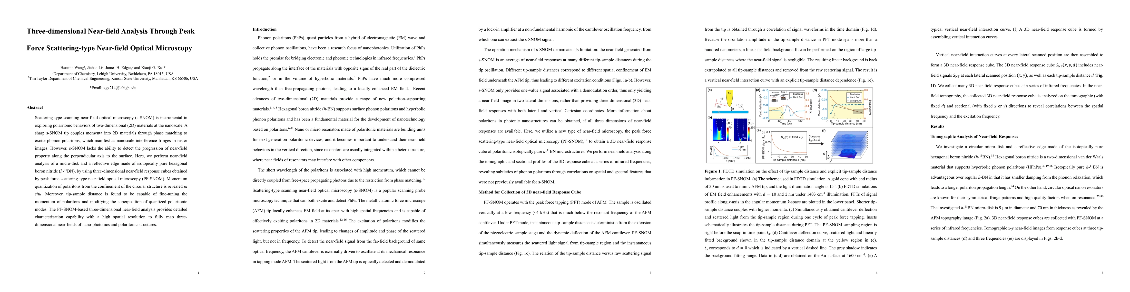 This paper utilizes peak force scattering-type near-field optical microscopy (PF-SNOM) to analyze the three-dimensional near-field properties of hexagonal boron nitride structures, revealing the momentum quantization of polaritons and demonstrating how tip-sample distance can modify polaritonic modes. The PF-SNOM technique provides high-resolution three-dimensional near-field mapping.