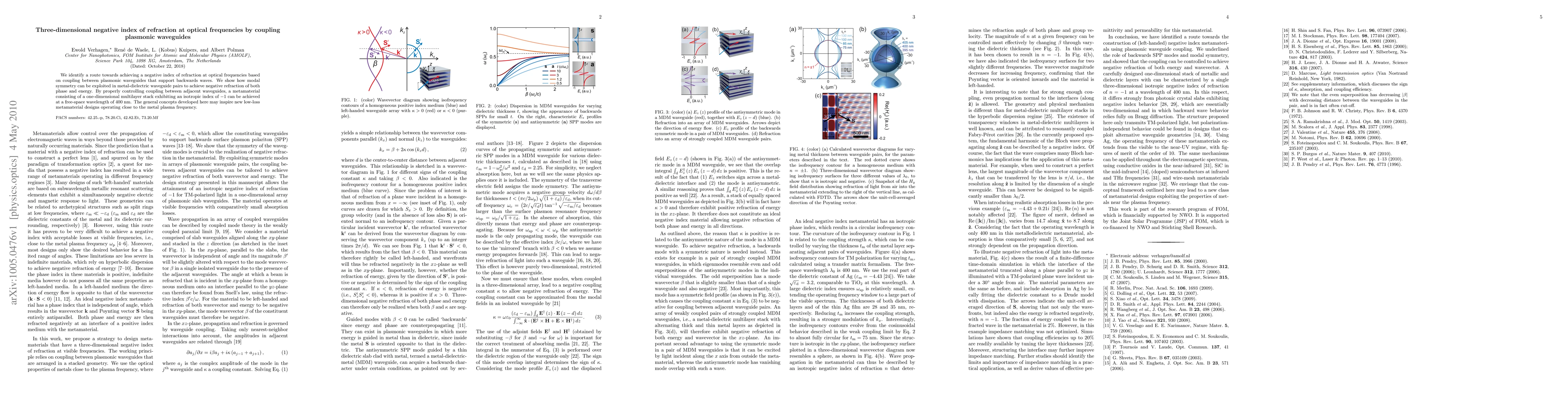 We identify a route towards achieving a negative index of refraction at optical frequencies based on coupling between plasmonic waveguides that support backwards waves. We show how modal symmetry can be exploited in metal-dielectric waveguide pairs to achieve negative refraction of both phase and energy. By properly controlling coupling between adjacent waveguides, a metamaterial consisting of a one-dimensional multilayer stack exhibiting an isotropic index of -1 can be achieved at a free-space wavelength of 400 nm. The general concepts developed here may inspire new low-loss metamaterial designs operating close to the metal plasma frequency.