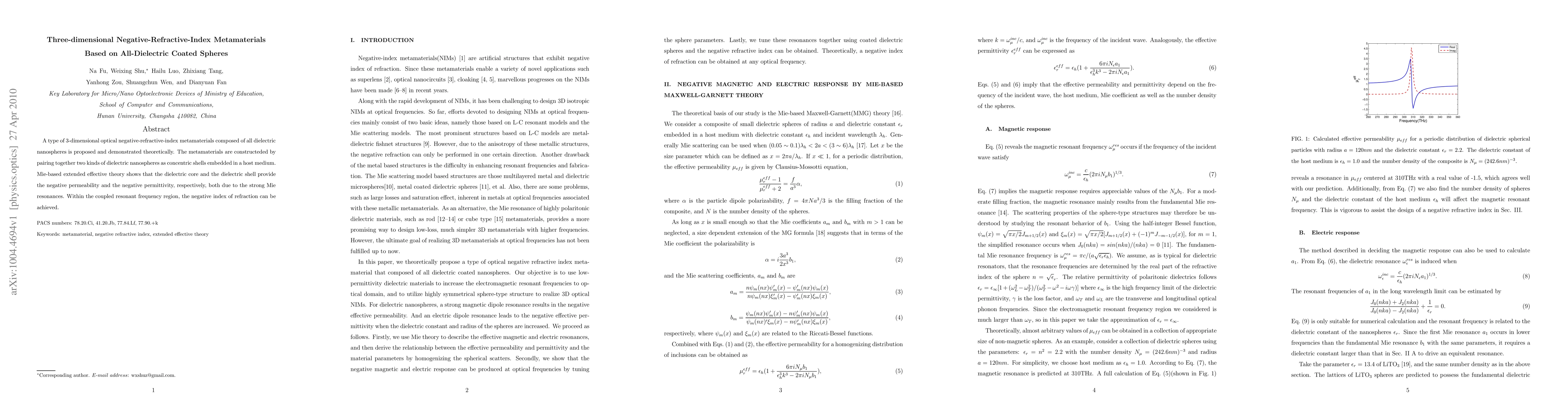 Summary: This paper proposes a 3D optical metamaterial using all-dielectric coated spheres that achieves negative refraction. The structure employs concentric dielectric shells within a host medium to provide negative permeability and permittivity, leading to a negative index of refraction within specific resonant frequencies.