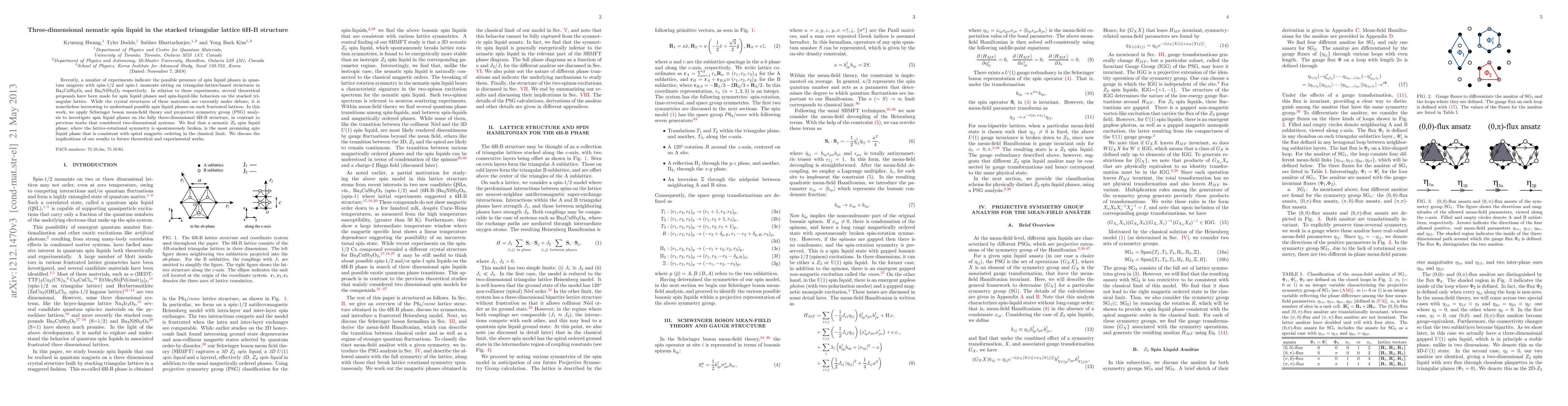 This paper investigates spin liquid phases in the three-dimensional 6H-B structure using Schwinger boson mean-field theory and PSG analysis. The study finds a nematic Z2 spin liquid phase, indicating spontaneous breaking of lattice-rotational symmetry, which is consistent with spiral magnetic ordering in the classical limit.