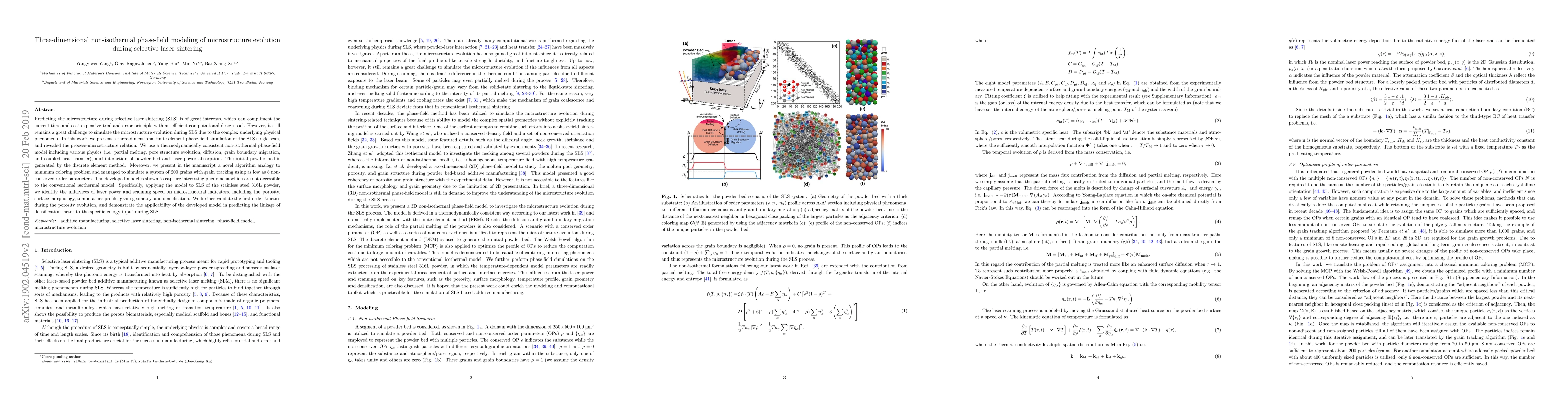 This paper presents a three-dimensional non-isothermal phase-field model to simulate the microstructure evolution during selective laser sintering (SLS), capturing complex phenomena like partial melting and pore formation. The model reveals the influence of laser power and scanning speed on microstructural indicators and validates the first-order kinetics of porosity evolution, offering a predictive tool for SLS processes.