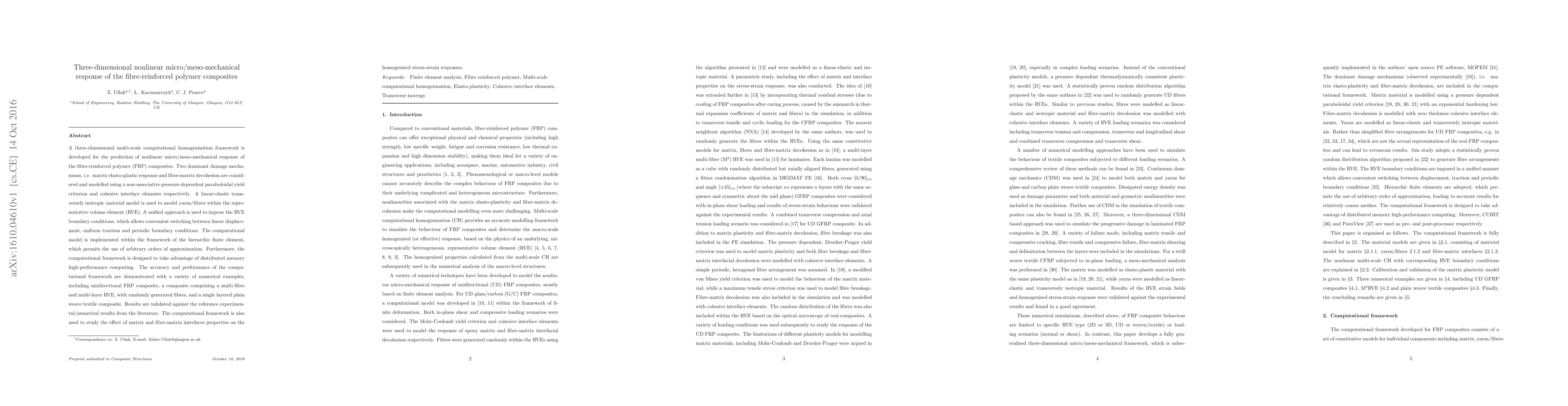 A three-dimensional multi-scale computational homogenisation framework is developed for the prediction of nonlinear micro/meso-mechanical response of the fibre-reinforced polymer (FRP) composites. Two dominant damage mechanisms, i.e. matrix elasto-plastic response and fibre-matrix decohesion are considered and modelled using a non-associative pressure dependent paraboloidal yield criterion and cohesive interface elements respectively. A linear-elastic transversely isotropic material model is used to model yarns/fibres within the representative volume element (RVE). A unified approach is used to impose the RVE boundary conditions, which allows convenient switching between linear displacement, uniform traction and periodic boundary conditions. The computational model is implemented within the framework of the hierarchic finite element, which permits the use of arbitrary orders of approximation. Furthermore, the computational framework is designed to take advantage of distributed memory high-performance computing. The accuracy and performance of the computational framework are demonstrated with a variety of numerical examples, including unidirectional FRP composite, a composite comprising a multi-fibre and multi-layer RVE, with randomly generated fibres, and a single layered plain weave textile composite. Results are validated against the reference experimental/numerical results from the literature. The computational framework is also used to study the effect of matrix and fibre-matrix interfaces properties on the homogenised stress-strain responses.