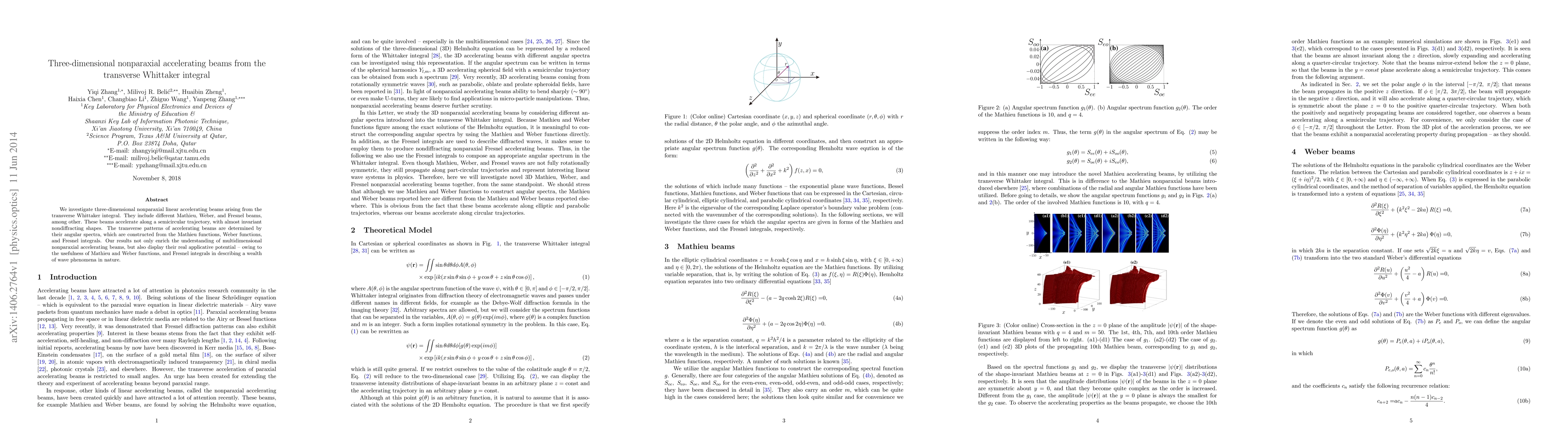 This research explores three-dimensional nonparaxial linear accelerating beams derived from the transverse Whittaker integral, including Mathieu, Weber, and Fresnel beams that follow semicircular trajectories with nearly invariant shapes. These beams' transverse patterns are determined by their angular spectra, which utilize Mathieu and Weber functions and Fresnel integrals, expanding the understanding of multidimensional wave phenomena.