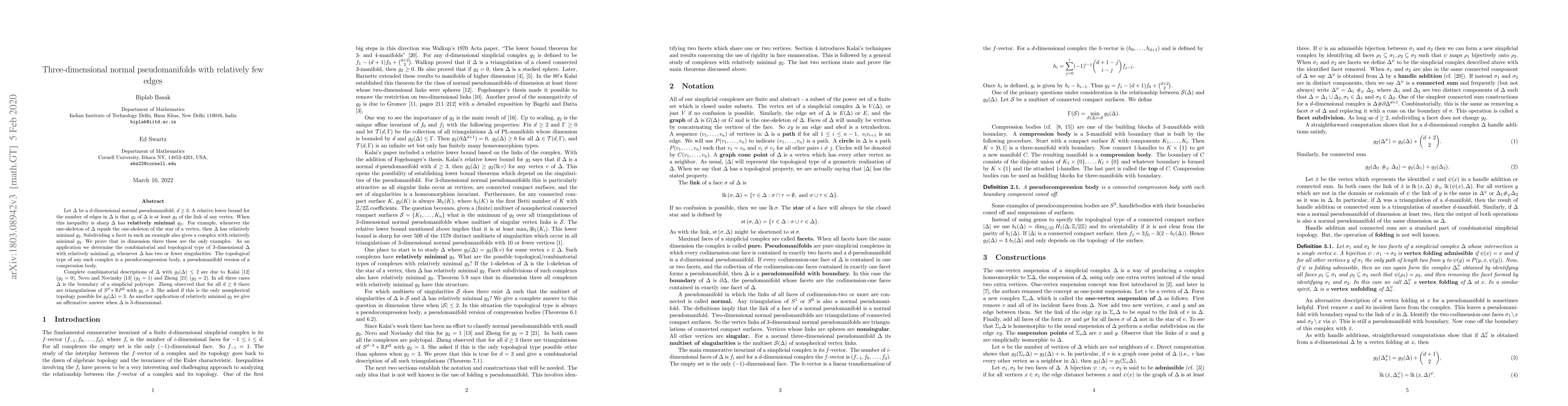 Let $\Delta$ be a $d$-dimensional normal pseudomanifold, $d \ge 3.$ A relative lower bound for the number of edges in $\Delta$ is that $g_2$ of $\Delta$ is at least $g_2$ of the link of any vertex. When this inequality is sharp $\Delta$ has relatively minimal $g_2$. For example, whenever the one-skeleton of $\Delta$ equals the one-skeleton of the star of a vertex, then $\Delta$ has relatively minimal $g_2.$ Subdividing a facet in such an example also gives a complex with relatively minimal $g_2.$ We prove that in dimension three these are the only examples. As an application we determine the combinatorial and topological type of $3$-dimensional $\Delta$ with relatively minimal $g_2$ whenever $\Delta$ has two or fewer singularities. The topological type of any such complex is a pseudocompression body, a pseudomanifold version of a compression body. Complete combinatorial descriptions of $\Delta$ with $g_2(\Delta) \le 2$ are due to Kalai [12] $(g_2=0)$, Nevo and Novinsky [13] $(g_2=1)$ and Zheng [21] $(g_2=2).$ In all three cases $\Delta$ is the boundary of a simplicial polytope. Zheng observed that for all $d \ge 0$ there are triangulations of $S^d \ast \mathbb{RP}^2$ with $g_2=3.$ She asked if this is the only nonspherical topology possible for $g_2(\Delta)=3.$ As another application of relatively minimal $g_2$ we give an affirmative answer when $\Delta$ is $3$-dimensional.