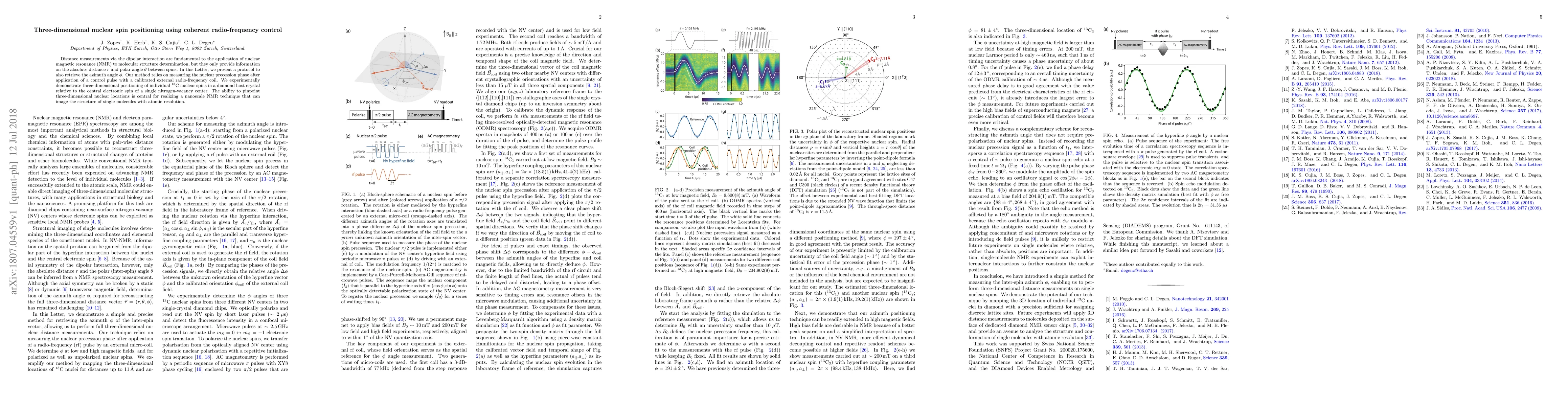 This paper presents a protocol for determining the azimuth angle $\phi$ in three-dimensional nuclear spin positioning using coherent radio-frequency control, enhancing NMR's ability to measure molecular structures. The method involves measuring nuclear precession phase after applying a control pulse, demonstrated experimentally for carbon-13 spins in a diamond crystal.
