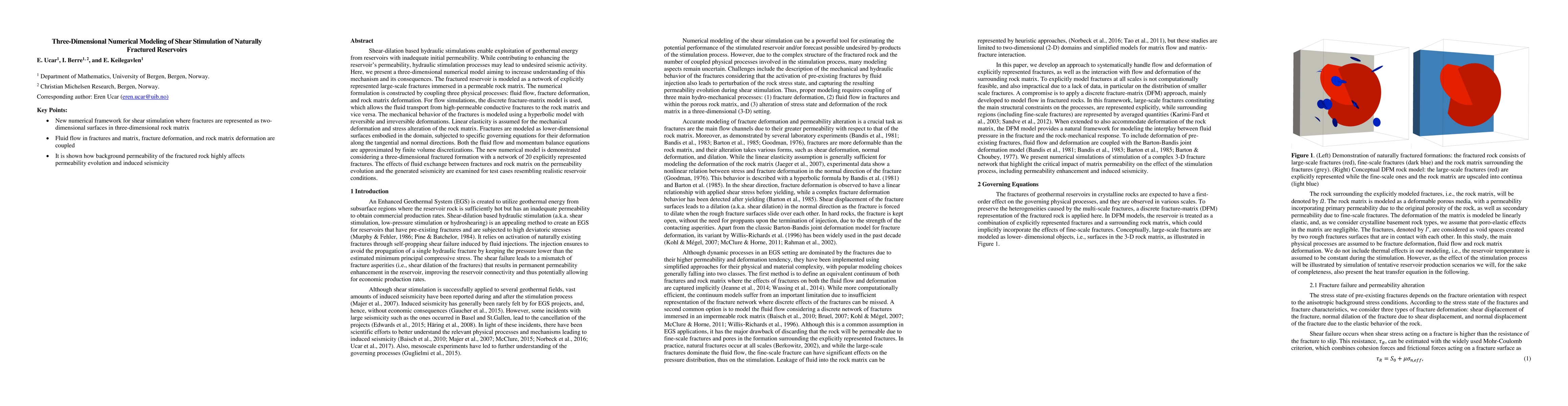 This paper presents a three-dimensional numerical model to study shear dilation-based hydraulic stimulation in naturally fractured geothermal reservoirs, focusing on permeability enhancement and induced seismic activity. The model couples fluid flow, fracture deformation, and rock matrix deformation to simulate the fluid transport and mechanical behavior in a network of explicitly represented fractures.