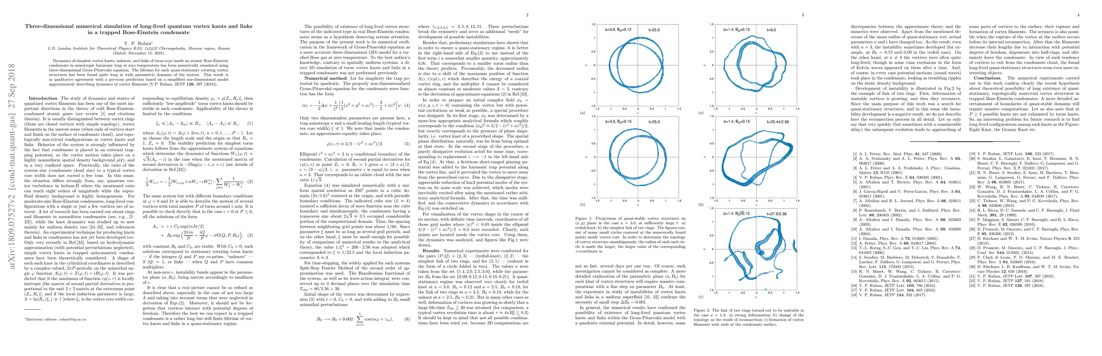 This paper presents a three-dimensional numerical simulation of long-lived quantum vortex knots and links in a trapped Bose-Einstein condensate using the Gross-Pitaevskii equation, finding that these quasi-stationary rotating structures have extended lifetimes. The results align with previous predictions from a simplified one-dimensional model.