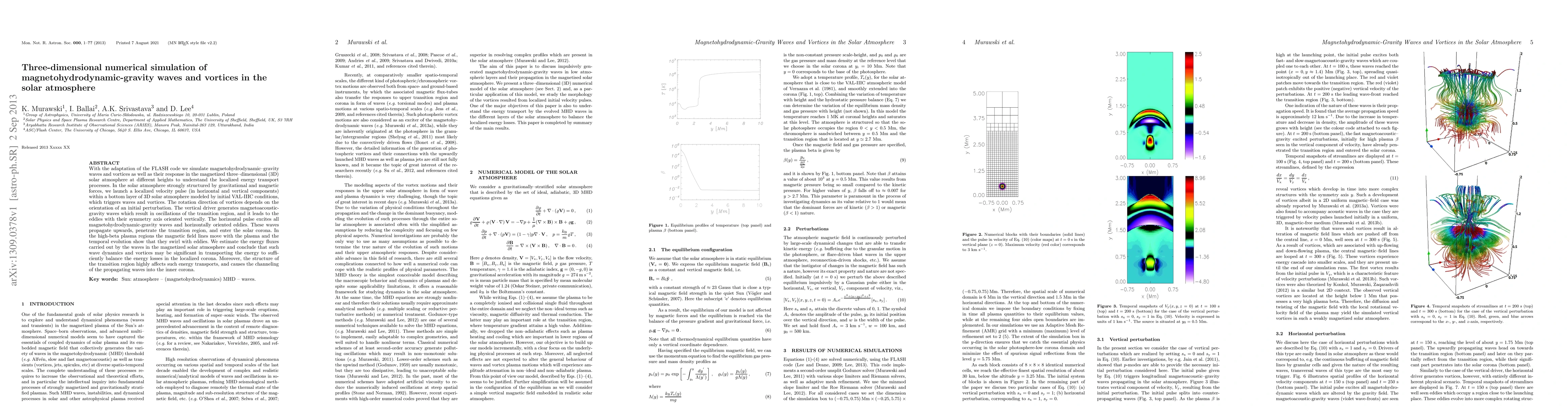 This paper uses 3D simulations to study magnetohydrodynamic-gravity waves and vortices in the solar atmosphere, revealing their role in localized energy transport. The study shows that waves and vortices generated by localized velocity pulses propagate upwards, influencing energy balance in the corona.