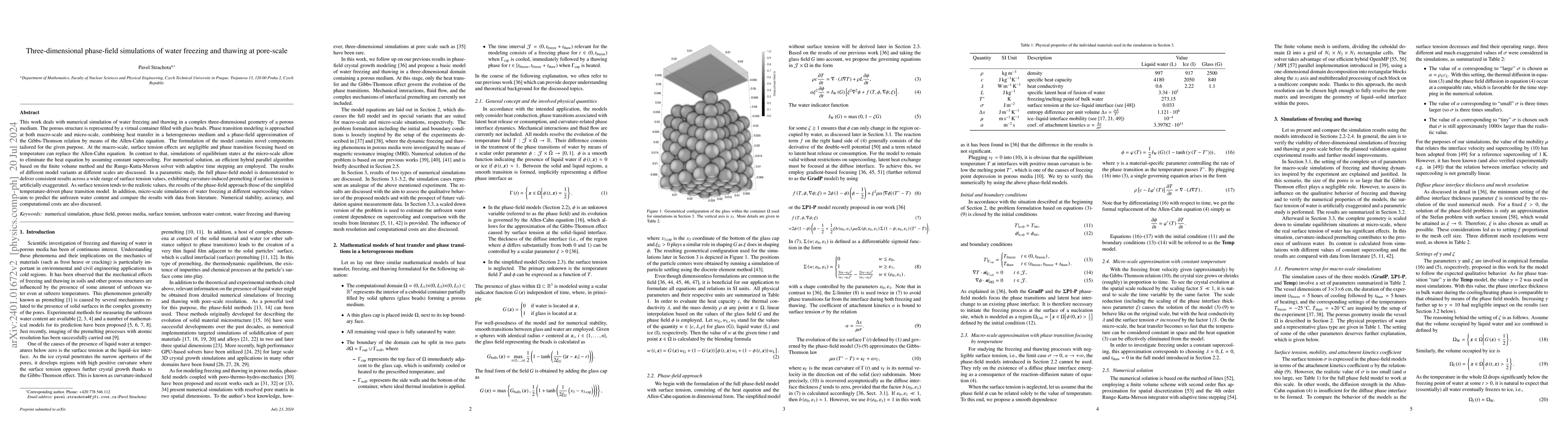 This work is concerned with numerical simulation of water freezing and thawing at pore scale, resolving the complex three-dimensional geometry of the porous medium. The used model of a porous structure represents a container partially filled with spherical glass beads. It has been created artificially by simulation of spheres gradually falling into the container and organizing themselves due to gravity and mutual collisions. For this purpose, an original model has been developed, based on particle interaction forces exponentially decreasing with distance . This model allows for accurate simulation of collisions with the coefficient of restitution anywhere between zero and one. The implementation is notably simple as it employs readily available high order ODE solvers with time step adaptivity, resolving the moments of collision in a natural way. For the modeling of the freezing and thawing processes, two approaches have been utilized: The phase field approach has been compared to the more simple solution of the heat equation in a heterogeneous medium, with phase transitions focusing based on temperature. The phase field approach considers the effects of surface tension leading to premelting, whereas the simplified model assumes that surface tension is neglected. The formulation of both models contains novel components tailored for the given situation. Their numerical solution has been implemented using an efficient hybrid parallel algorithm based on the finite volume method and the Runge-Kutta-Merson solver with adaptive time stepping. Qualitative comparison of the results of both phase transition modeling approaches is performed and the influence of surface tension is analyzed. Numerical stability, accuracy, and computational costs are also discussed.