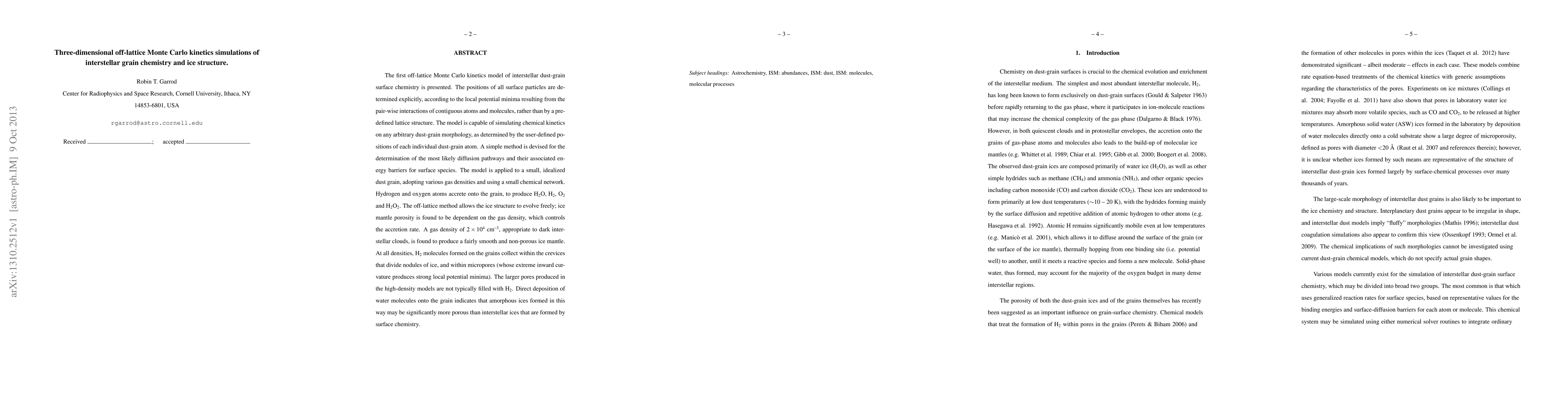 This paper presents an off-lattice Monte Carlo kinetics model for simulating interstellar dust-grain surface chemistry and ice structure, allowing for the explicit determination of particle positions based on local potential minima. The model reveals that gas density significantly influences ice mantle porosity, with higher densities producing smoother and less porous ice, while H2 molecules accumulate in crevices and micropores.