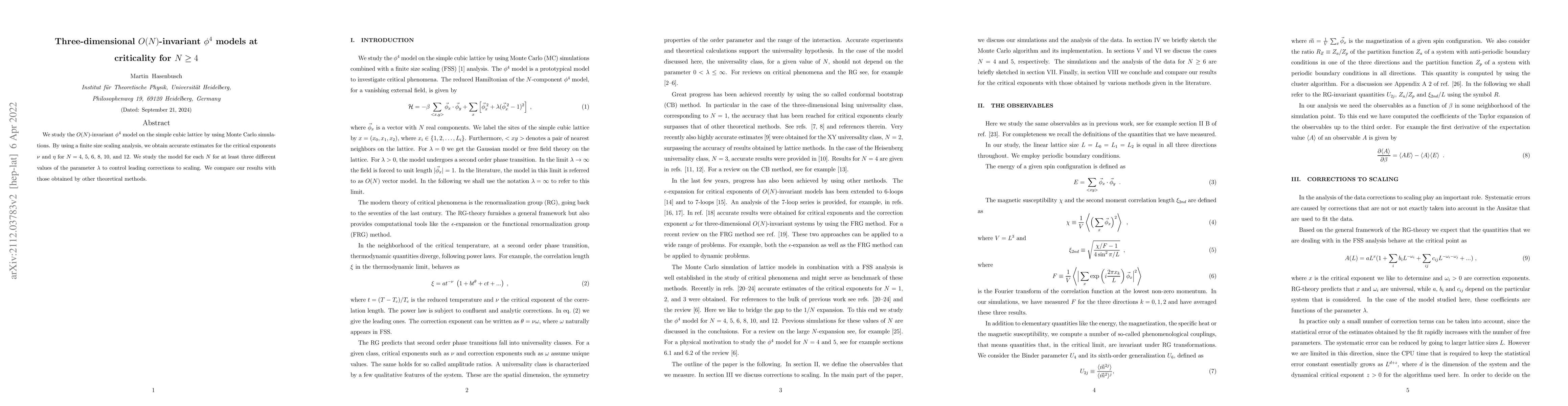 The study uses Monte Carlo simulations to investigate the critical behavior of $O(N)$-invariant $\phi^4$ models on a simple cubic lattice for $N \ge 4$, obtaining accurate estimates for critical exponents $\nu$ and $\eta$ across several values of $N$. The results are compared with theoretical predictions.