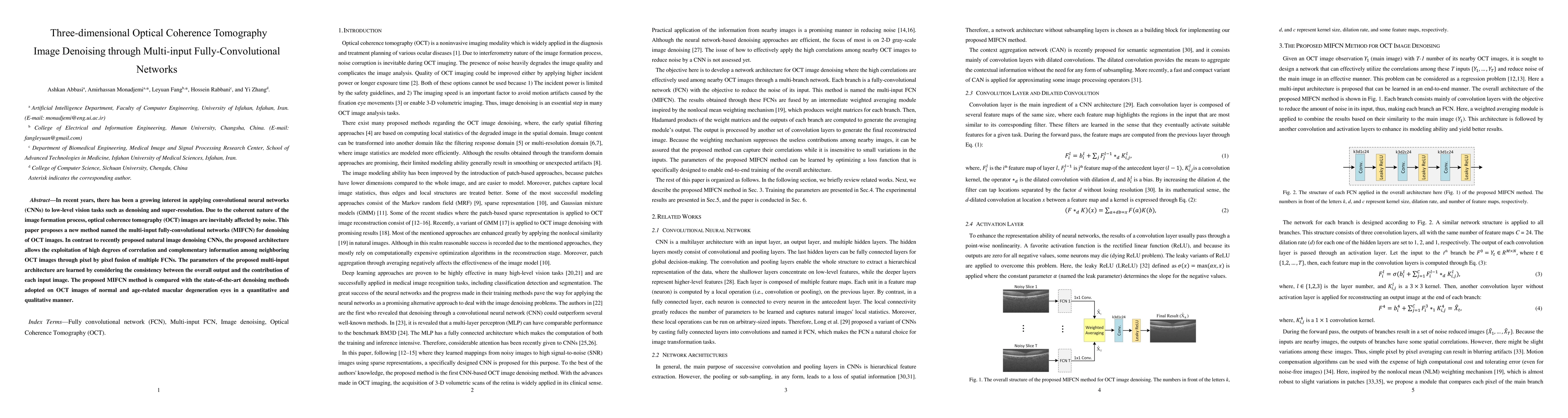 This paper introduces a multi-input fully-convolutional network (MIFCN) for denoising three-dimensional optical coherence tomography (OCT) images, leveraging pixel-by-pixel fusion of multiple FCNs to exploit correlations among neighboring OCT images. The method is evaluated against state-of-the-art techniques for its effectiveness in denoising OCT images from normal and age-related macular degeneration eyes.