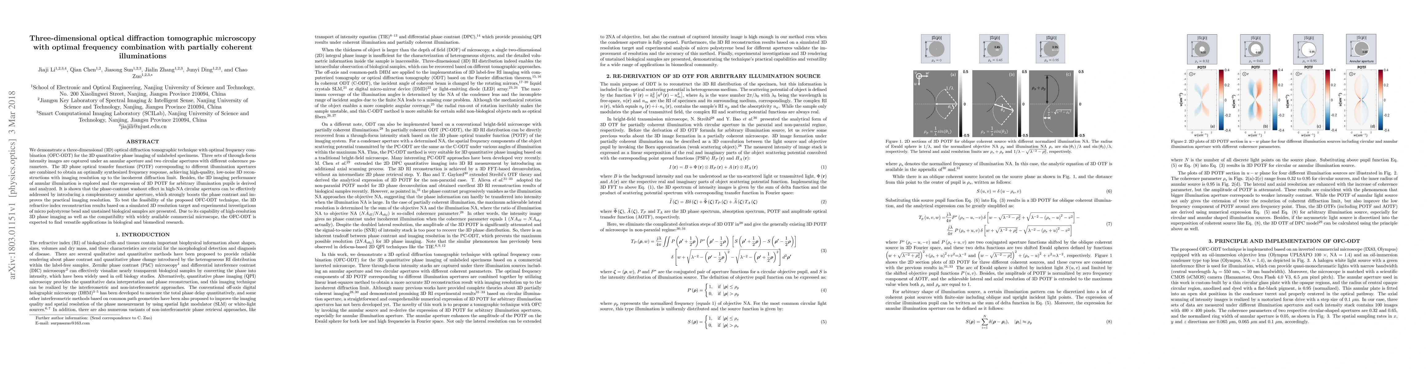This paper presents a three-dimensional optical diffraction tomographic microscopy technique with optimal frequency combination (OFC-ODT) for high-resolution quantitative phase imaging of unlabeled specimens. The method combines 3D phase optical transfer functions from different illumination apertures to achieve low-noise 3D reconstructions, effectively addressing phase-contrast washout effects and improving imaging resolution.