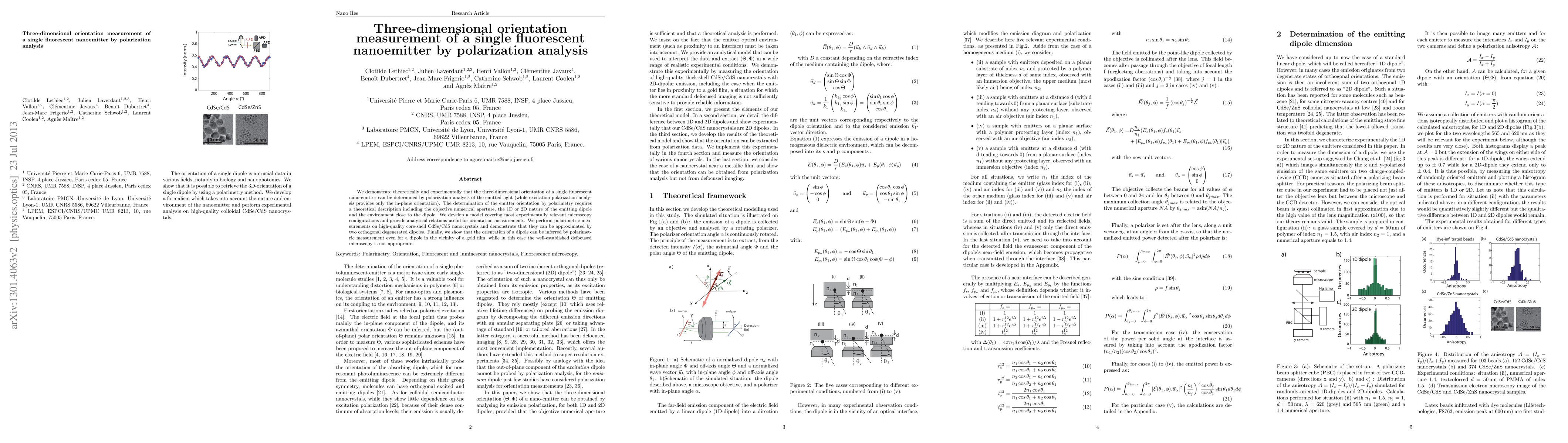 This paper presents a theoretical and experimental method for determining the three-dimensional orientation of a single fluorescent nano-emitter through polarization analysis of emitted light. The developed model accounts for various microscopy configurations and demonstrates the technique using high-quality CdSe/CdS nanocrystals.