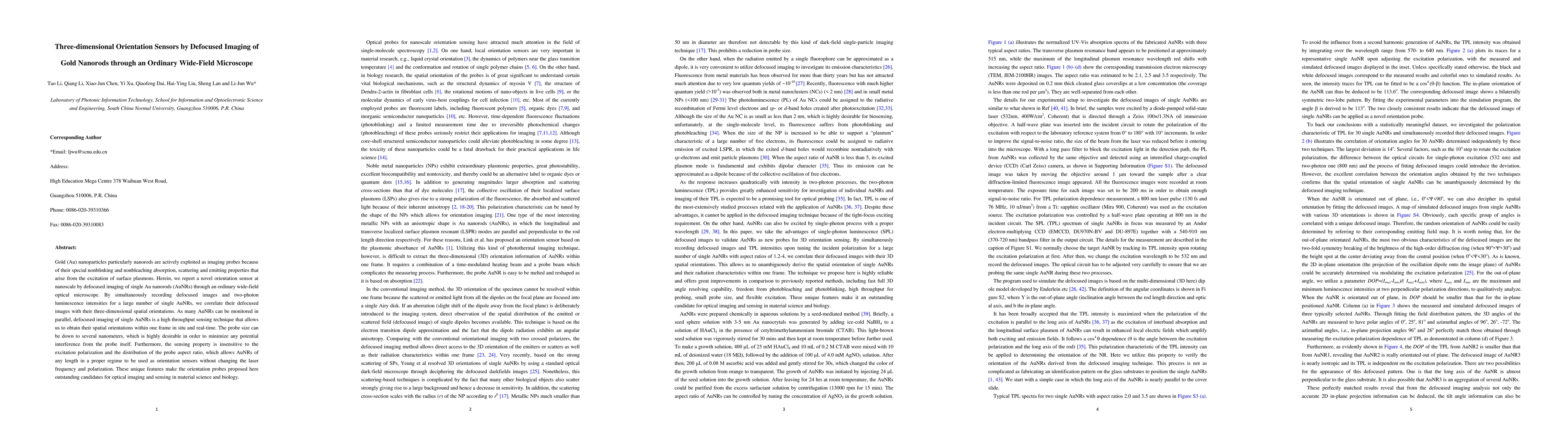 This paper presents a novel high-throughput method for determining the three-dimensional orientation of gold nanorods using defocused imaging through a standard wide-field microscope. The method correlates defocused images with the spatial orientations of the nanorods, offering real-time, in situ sensing with minimal interference.