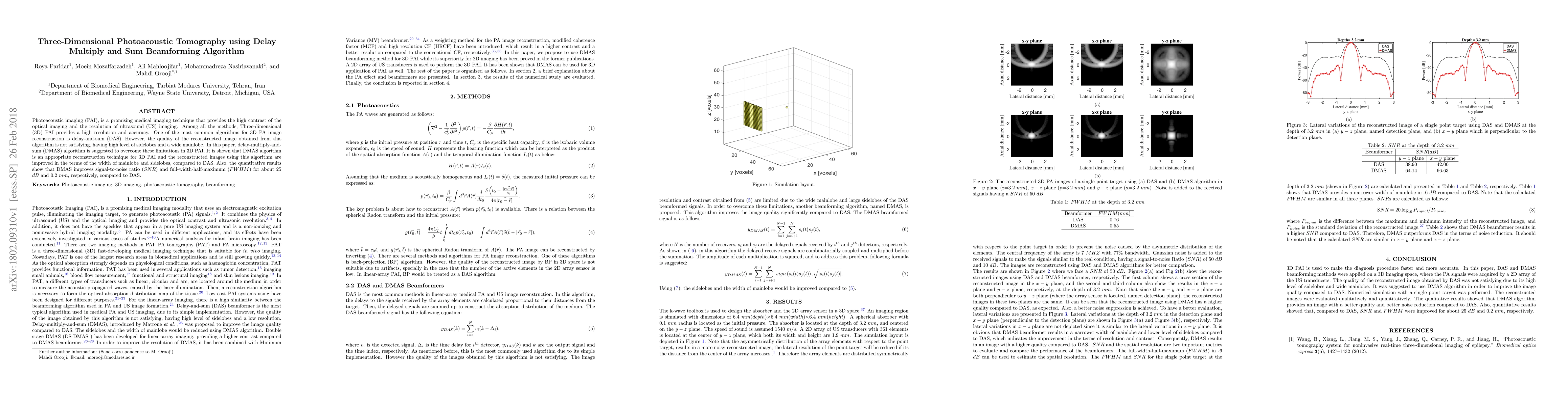 This paper proposes the delay-multiply-and-sum (DMAS) algorithm for improving three-dimensional photoacoustic tomography (3D PAI) reconstruction, showing better resolution and signal-to-noise ratio compared to the traditional delay-and-sum (DAS) method. DMAS reduces sidelobes and narrows the mainlobe, enhancing image quality.