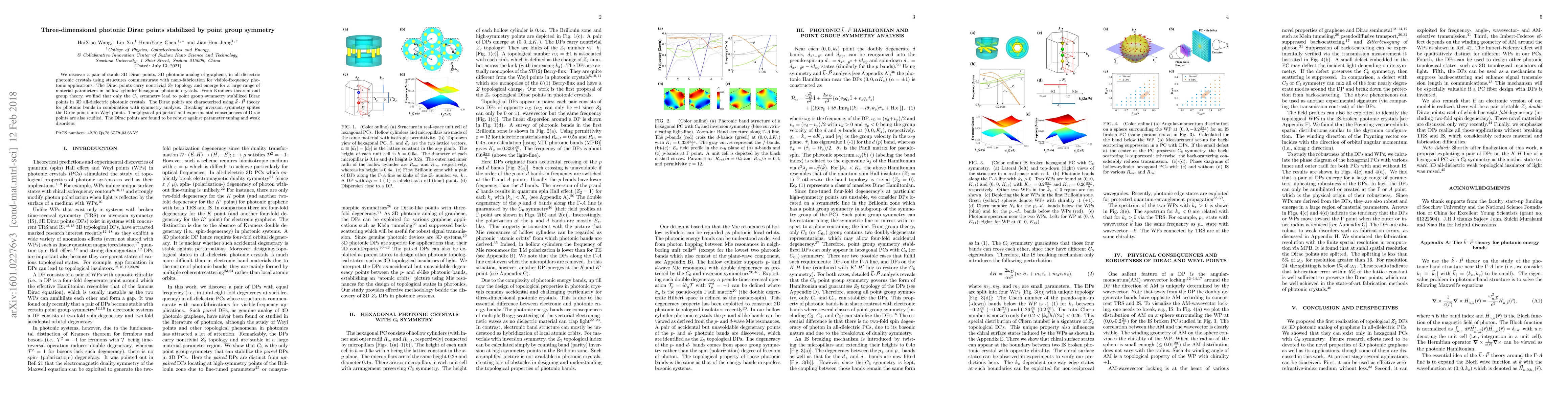 We discover a pair of stable 3D Dirac points, 3D photonic analog of graphene, in all-dielectric photonic crystals using structures commensurate with nano-fabrication for visible-frequency photonic applications. The Dirac points carry nontrivial $Z_2$ topology and emerge for a large range of material parameters in hollow cylinder hexagonal photonic crystals. From Kramers theorem and group theory, we find that only the $C_6$ symmetry lead to point group symmetry stabilized Dirac points in 3D all-dielectric photonic crystals. {The Dirac points are characterized using ${\vec k}\cdot{\vec P}$ theory for photonic bands in combination with symmetry analysis. Breaking inversion symmetry splites the Dirac points into Weyl points. The physical properties and experimental consequences of Dirac points are also studied. The Dirac points are found to be robust against parameter tuning and weak disorders.