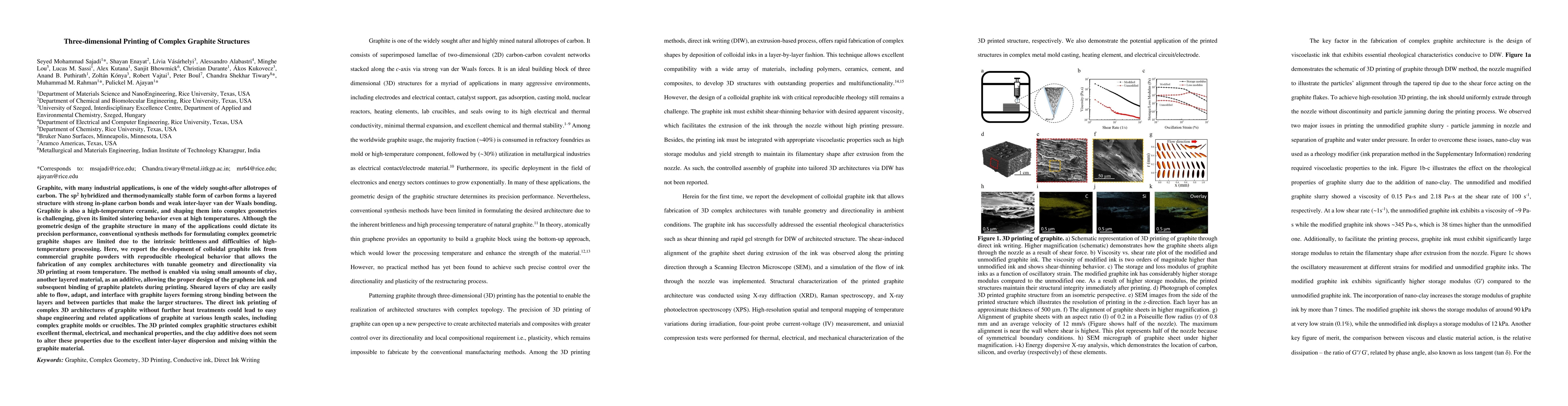 This research introduces a method to 3D print complex graphite structures using a colloidal graphite ink, overcoming traditional processing challenges. The ink, made from commercial graphite powders and small clay additives, maintains graphite's excellent properties without heat treatment, enabling precise shape engineering for various applications.