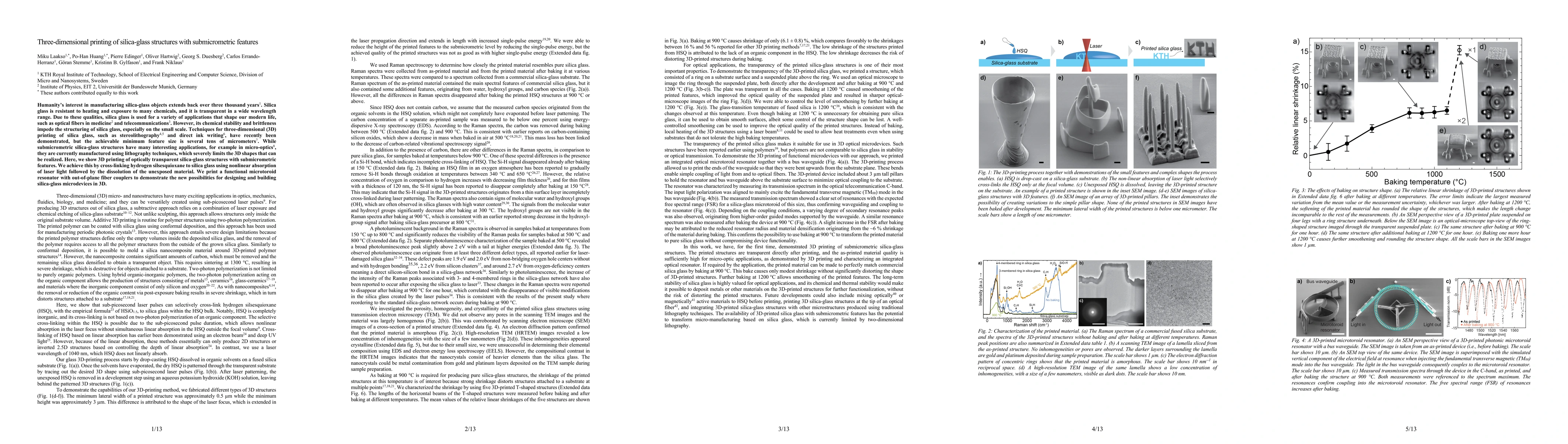 This paper demonstrates the 3D printing of silica-glass structures with submicrometric features, overcoming the limitations of current techniques. The method uses nonlinear absorption of laser light to cross-link hydrogen silsesquioxane, enabling the creation of optically transparent microdevices, such as a functional microtoroid resonator.