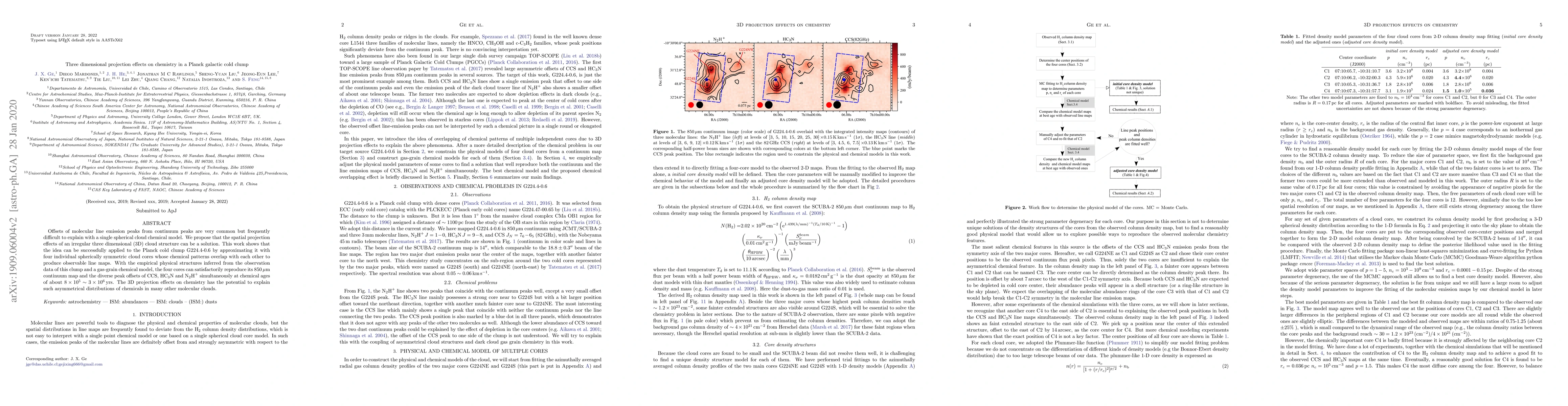 Offsets of molecular line emission peaks from continuum peaks are very common but frequently difficult to explain with a single spherical cloud chemical model. We propose that the spatial projection effects of an irregular three dimensional (3D) cloud structure can be a solution. This work shows that the idea can be successfully applied to the Planck cold clump G224.4-0.6 by approximating it with four individual spherically symmetric cloud cores whose chemical patterns overlap with each other to produce observable line maps. With the empirical physical structures inferred from the observation data of this clump and a gas-grain chemical model, the four cores can satisfactorily reproduce its 850 $\mu$m continuum map and the diverse peak offsets of CCS, HC$_3$N and N$_2$H$^+$ simultaneously at chemical ages of about $8\times 10^5\sim 3\times 10^6$ yrs. The 3D projection effects on chemistry has the potential to explain such asymmetrical distributions of chemicals in many other molecular clouds.