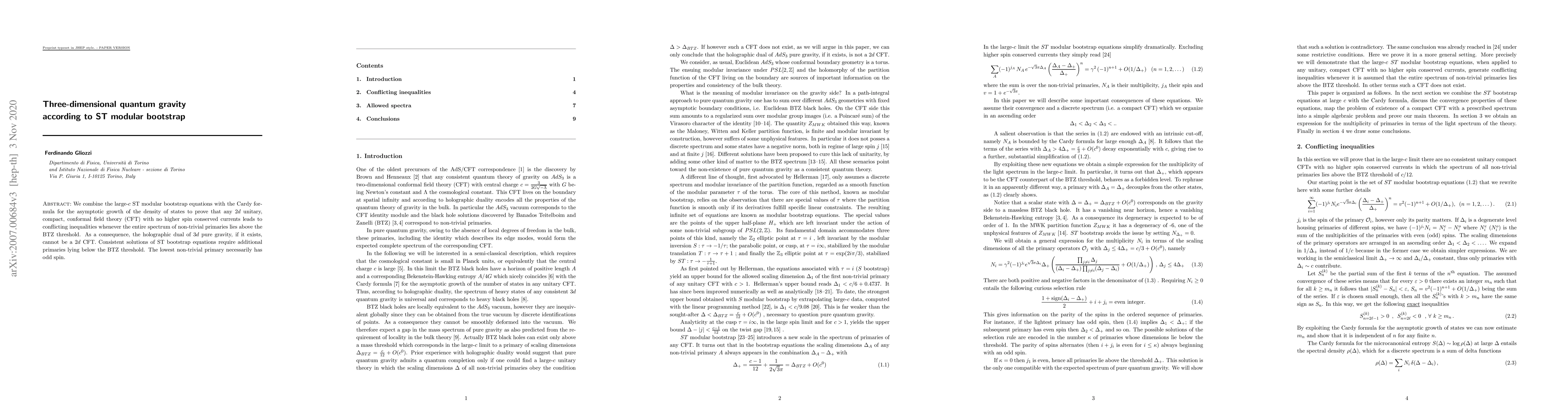 We combine the large-$c$ ST modular bootstrap equations with the Cardy formula for the asymptotic growth of the density of states to prove that any $2d$ unitary, compact, conformal field theory (CFT) with no higher spin conserved currents leads to conflicting inequalities whenever the entire spectrum of non-trivial primaries lies above the BTZ threshold. As a consequence, the holographic dual of $3d$ pure gravity, if it exists, cannot be a $2d$ CFT. Consistent solutions of ST bootstrap equations require additional primaries lying below the BTZ threshold. The lowest non-trivial primary necessarily has odd spin