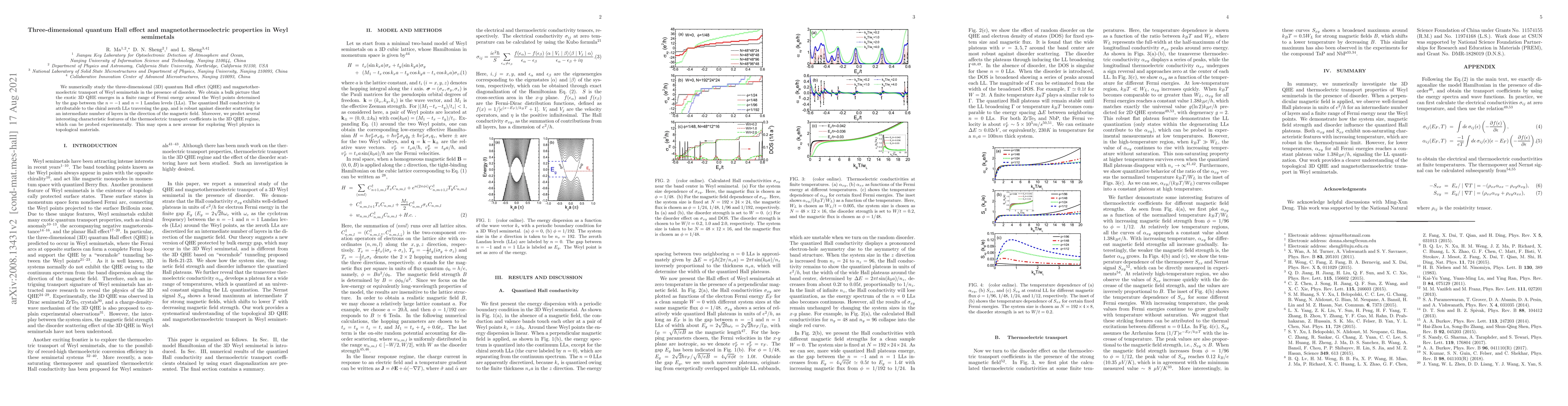This paper numerically investigates the three-dimensional quantum Hall effect (3D QHE) and magnetothermoelectric properties in Weyl semimetals, revealing that the 3D QHE emerges near Weyl points and is robust against disorder. The study also predicts notable thermoelectric features in this regime, suggesting potential experimental exploration of Weyl physics in topological materials.