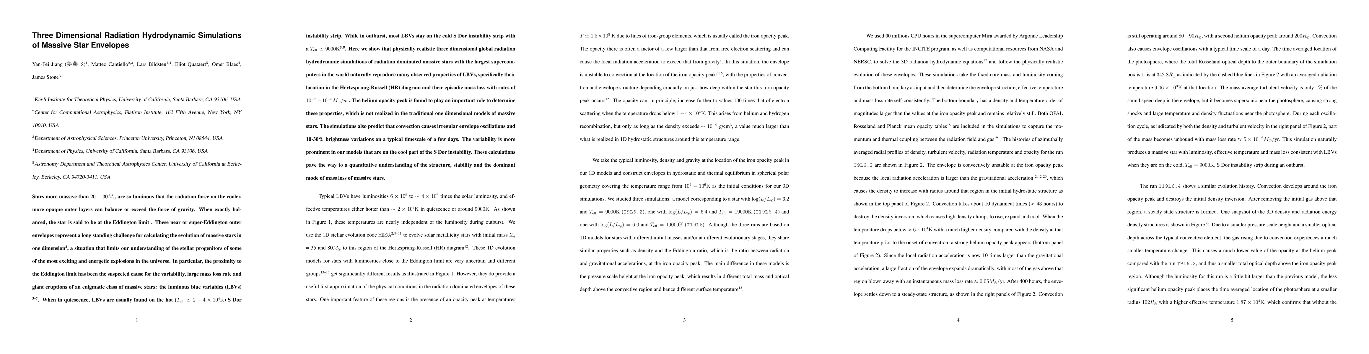 (Abridged) Stars more massive than $20-30M_{\odot}$ are so luminous that the radiation force on the cooler, more opaque outer layers can balance or exceed the force of gravity. These near or super-Eddington outer envelopes represent a long standing challenge for calculating the evolution of massive stars in one dimension, a situation that limits our understanding of the stellar progenitors of some of the most exciting and energetic explosions in the universe. In particular, the proximity to the Eddington limit has been the suspected cause for the variability, large mass loss rate and giant eruptions of an enigmatic class of massive stars: the luminous blue variables (LBVs). When in quiescence, LBVs are usually found on the hot ($T_{eff} \approx 2 - 4 \times 10^4$ K) S Dor instability strip. While in outburst, most LBVs stay on the cold S Dor instability strip with a $T_{eff} \approx 9000$ K. Here we show that physically realistic three dimensional global radiation hydrodynamic simulations of radiation dominated massive stars with the largest supercomputers in the world naturally reproduce many observed properties of LBVs, specifically their location in the Hertzsprung-Russell (HR) diagram and their episodic mass loss with rates of $10^{-7}-10^{-5} M_{\odot}/yr$. The helium opacity peak is found to play an important role to determine these properties, which is not realized in the traditional one dimensional models of massive stars. The simulations also predict that convection causes irregular envelope oscillations and 10-30% brightness variations on a typical timescale of a few days. The variability is more prominent in our models that are on the cool part of the S Dor instability. These calculations pave the way to a quantitative understanding of the structure, stability and the dominant mode of mass loss of massive stars.