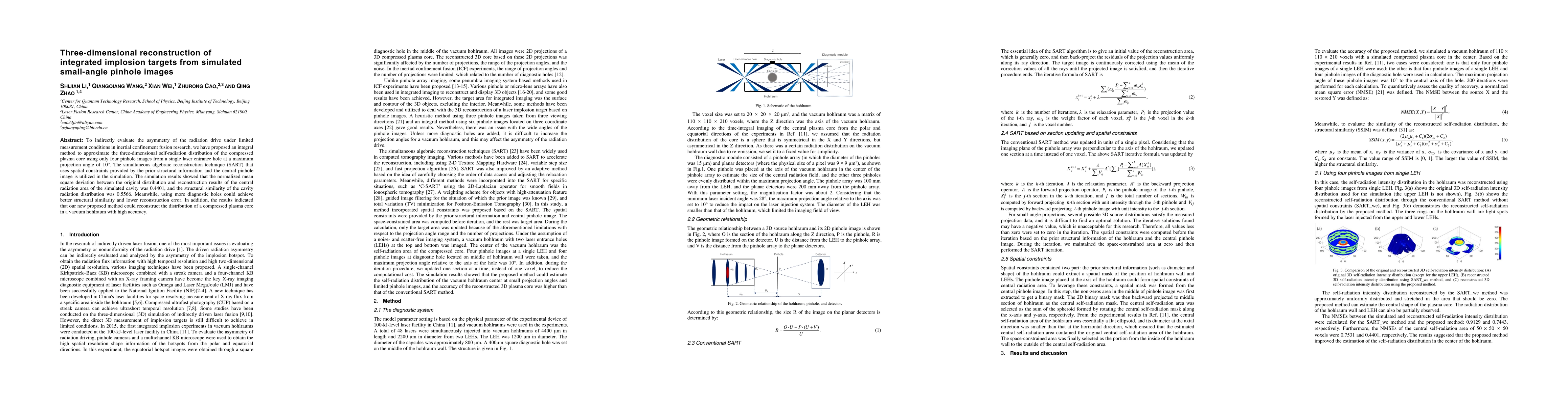 To indirectly evaluate the asymmetry of the radiation drive under limited measurement conditions in inertial confinement fusion research, we have proposed an integral method to approximate the three-dimensional self-radiation distribution of the compressed plasma core using only four pinhole images from a single laser entrance hole at a maximum projection angle of 10{\deg}. The simultaneous algebraic reconstruction technique (SART) that uses spatial constraints provided by the prior structural information and the central pinhole image is utilized in the simulation. The simulation results showed that the normalized mean square deviation between the original distribution and reconstruction results of the central radiation area of the simulated cavity was 0.4401, and the structural similarity of the cavity radiation distribution was 0.5566. Meanwhile, using more diagnostic holes could achieve better structural similarity and lower reconstruction error. In addition, the results indicated that our new proposed method could reconstruct the distribution of a compressed plasma core in a vacuum hohlraum with high accuracy.
