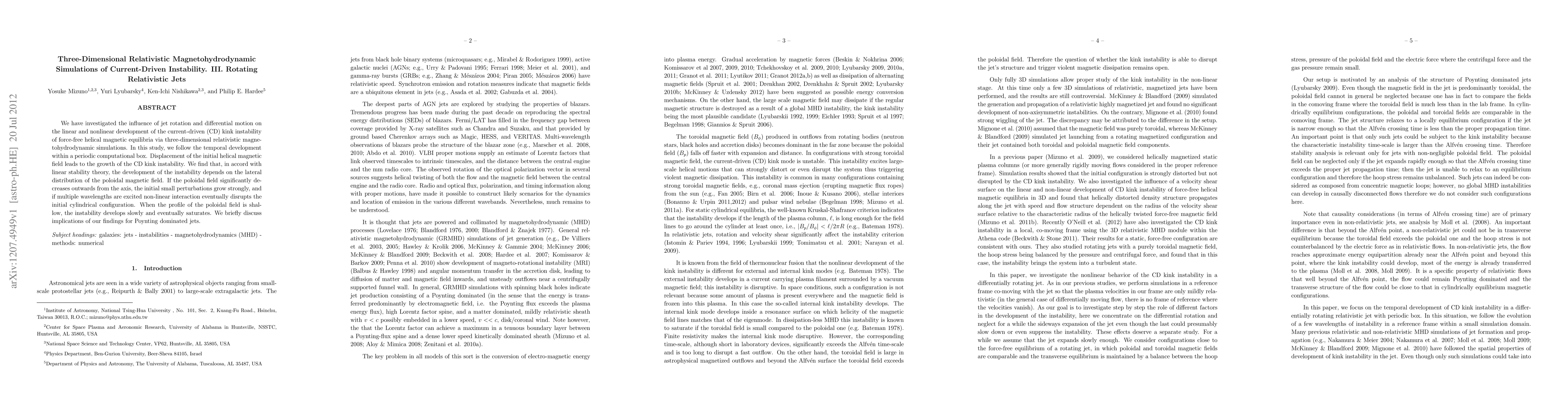 This paper examines the effects of jet rotation and differential motion on the current-driven kink instability in relativistic jets through three-dimensional simulations. The study finds that the instability's growth depends on the poloidal magnetic field's distribution, with strong growth and eventual disruption when the field decreases significantly outward from the axis.