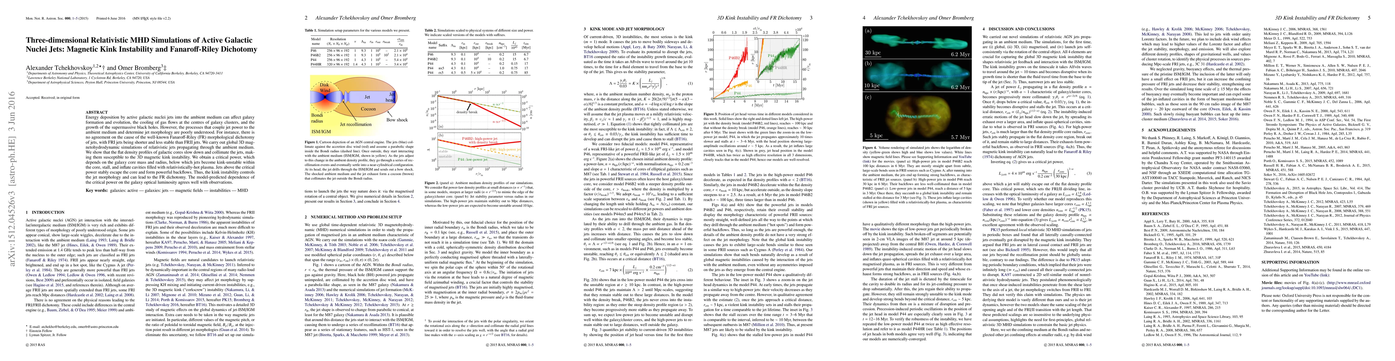 This paper presents 3D relativistic MHD simulations showing that magnetic kink instability in active galactic nuclei jets, influenced by the density profiles of galactic cores, determines jet morphology and explains the Fanaroff-Riley dichotomy, with lower-power jets stalling and higher-power jets escaping to form powerful backflows.