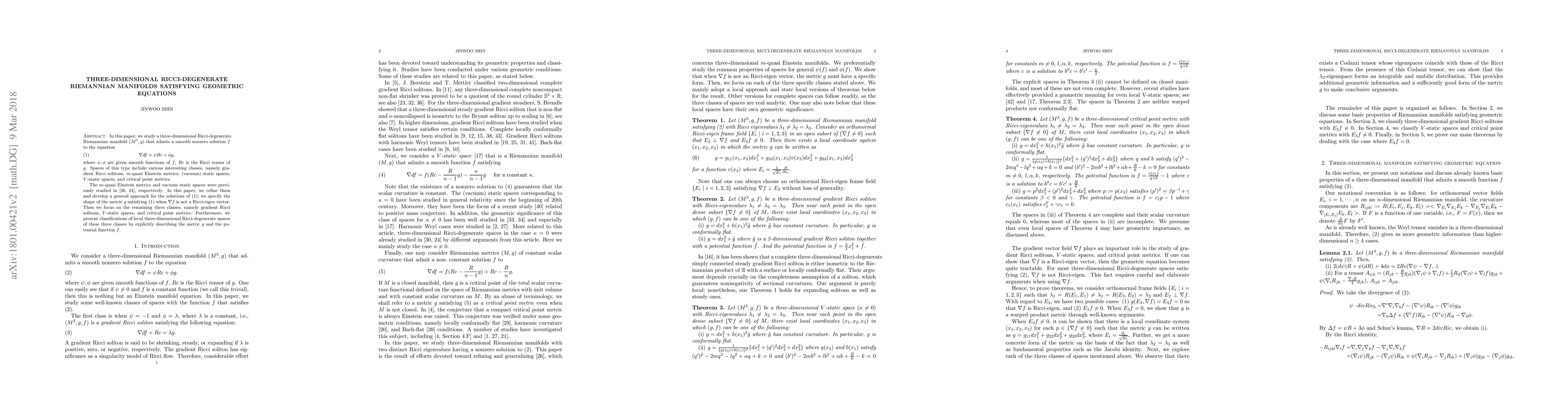 In this paper, we study a three-dimensional Ricci-degenerate Riemannian manifold $(M^3,g)$ that admits a smooth nonzero solution $f$ to the equation \begin{align} \label{a1a} \nabla df=\psi Rc+\phi g, \end{align} where $\psi,\phi$ are given smooth functions of $f$, $Rc$ is the Ricci tensor of $g$. Spaces of this type include various interesting classes, namely gradient Ricci solitons, $m$-quasi Einstein metrics, (vacuum) static spaces, $V$-static spaces, and critical point metrics. The $m$-quasi Einstein metrics and vacuum static spaces were previously studied in \cite{JJ,JEK}, respectively. In this paper, we refine them and develop a general approach for the solutions of (\ref{a1a}); we specify the shape of the metric $g$ satisfying (\ref{a1a}) when $\nabla f$ is not a Ricci-eigen vector. Then we focus on the remaining three classes, namely gradient Ricci solitons, $V$-static spaces, and critical point metrics. Furthermore, we present classifications of local three-dimensional Ricci-degenerate spaces of these three classes by explicitly describing the metric $g$ and the potential function $f$.