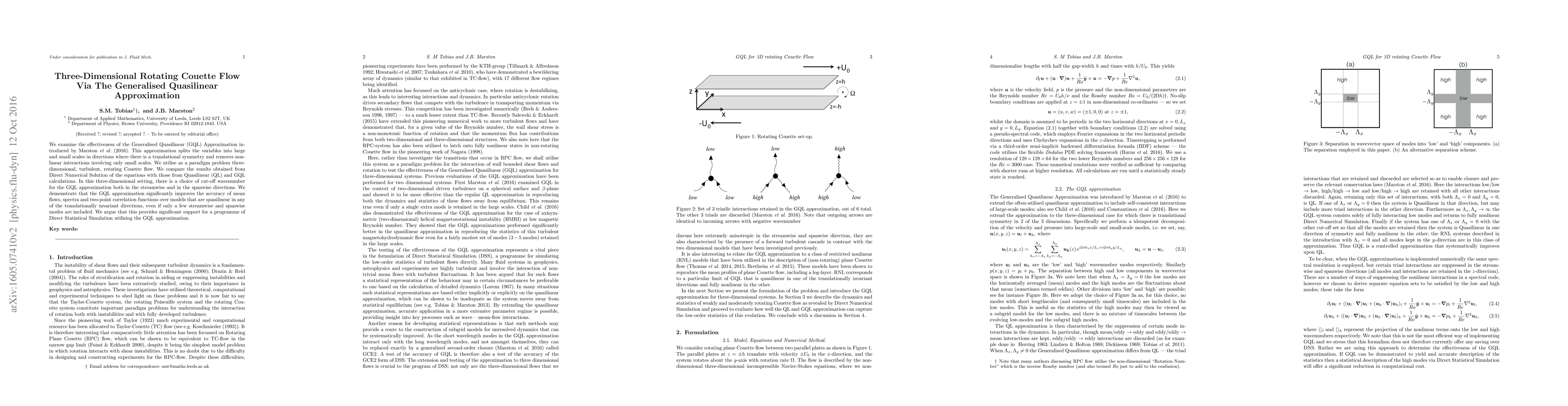 We examine the effectiveness of the Generalised Quasilinear (GQL) Approximation introduced by Marston et al (2016). This approximation splits the variables into large and small scales in directions where there is a translational symmetry and removes nonlinear interactions involving only small scales. We utilise as a paradigm problem three-dimensional, turbulent, rotating Couette flow. We compare the results obtained from Direct Numerical Solution of the equations with those from Quasilinear (QL) and GQL calculations. In this three-dimensional setting, there is a choice of cut-off wavenumber for the GQL approximation both in the streamwise and in the spanwise directions. We demonstrate that the GQL approximation significantly improves the accuracy of mean flows, spectra and two-point correlation functions over models that are quasilinear in any of the translationally invariant directions, even if only a few streamwise and spanwise modes are included. We argue that this provides significant support for a programme of Direct Statistical Simulation utilising the GQL approximation.